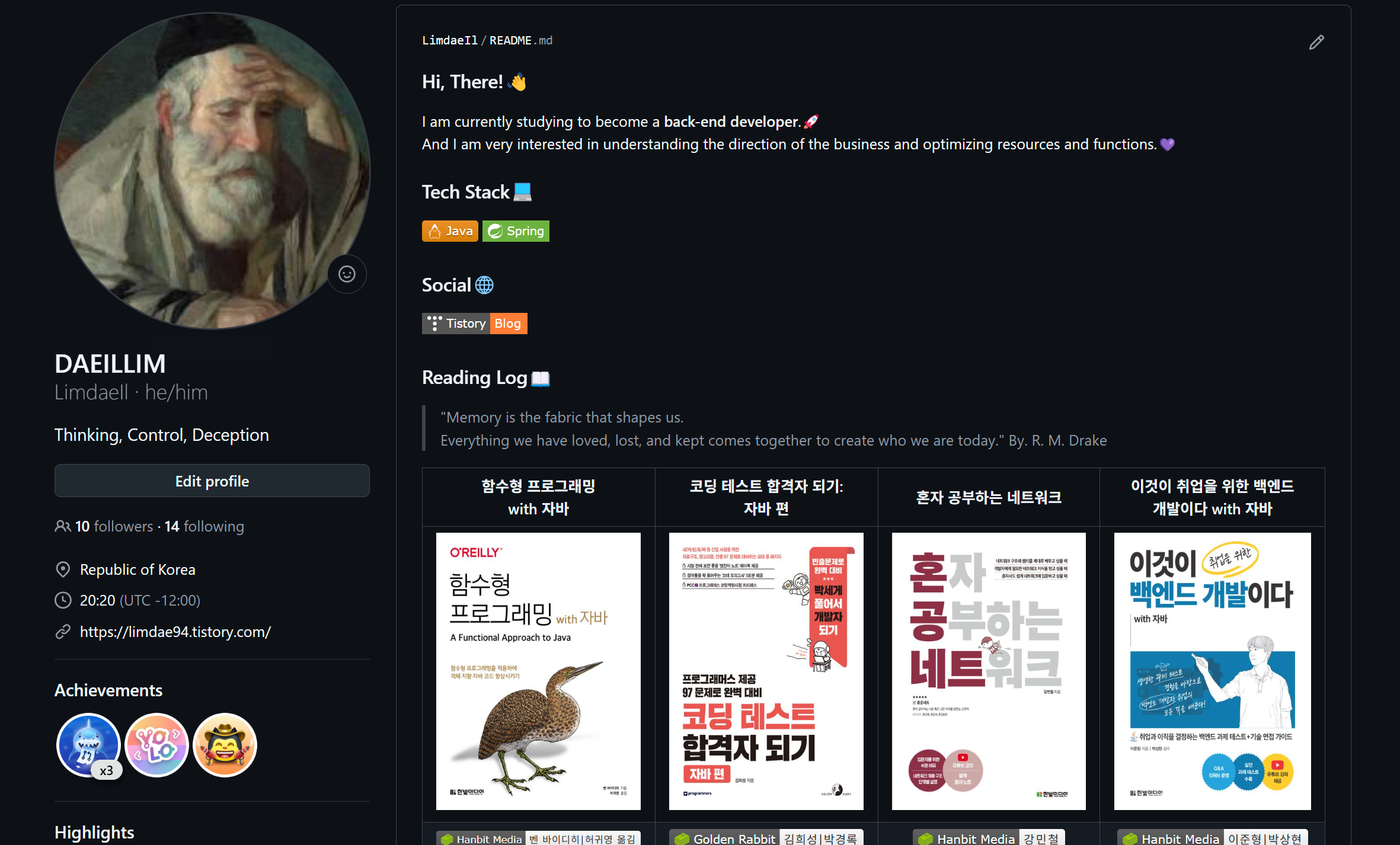 2025년 새해를 맞아 깃허브 프로필도 새롭게 단장했다. README.md 파일을 통해 한눈에 알아보기 쉽게 꾸몄고, 개인적으로 만족스럽게 느껴진다. 다만, 웹 브라우저에서는 이쁘게 보이는 레이아웃이 스마트폰에서는 최적화되지 않은 점은 아쉽다. 책과 강의 이미지 파일을 고정형 레이아웃 방식으로 추가했기 때문이다. 앞으로는 공부한 책과 강의 내용을 티스토리에 체계적으로 정리하고, 깃허브 README.md에는 이러한 목록을 꾸준히 업데이트할 계획이다.