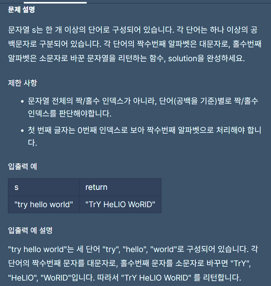 위의 [입출력 예]와 다르게 "try hello world"이면 "TrY HeLlO WoRlD"가 정답이다.