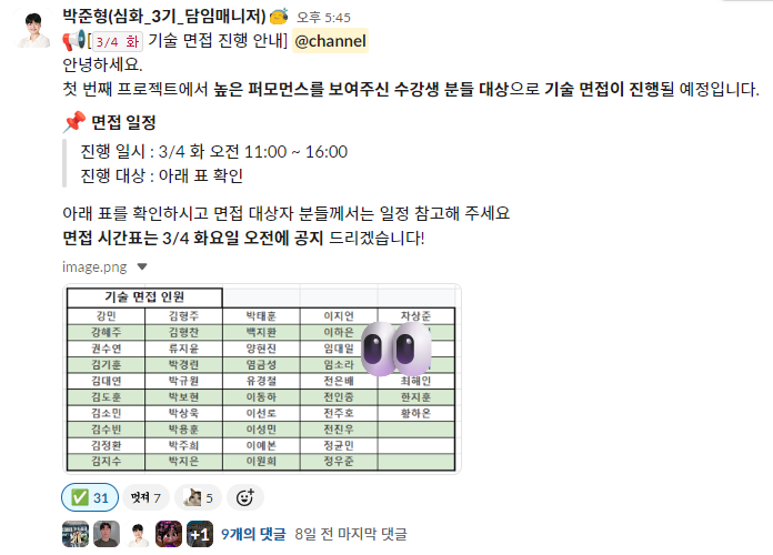 오랜 고민 끝에 내가 나아가야 할 방향을 다시 명확히 잡게 되었다. 새롭게 공부 계획을 세우며 열정을 다지고 있던 와중에, 갑자기 기술 면접 진행 공지가 나왔다. 사실 내 원래 계획은 1차 프로젝트에서 최대한 눈에 띄지 않고 기본에 충실한 개발을 하는 것이었다. 지금은 취업을 목표로 배우는 기간이기 때문에 프로젝트의 요구사항 충족보다 코드와 이론을 바탕으로 문제를 스스로 고민하며 해결하는 역량을 기르는 것이 절대적으로 중요하다고 생각했기 때문이다. 강의나 책을 단 한 번에 완벽히 흡수할 수 있는 기적은 없으며, 끊임없이 스스로 정진하는 과정이 반드시 필요하다는 사실을 여러 차례 경험을 통해 잘 알고 있다. 그래서 현재 나에게는 프로젝트 결과에 집중하기보다는 기초를 견고하게 다지고 흔들리지 않는 탄탄한 기반을 만드는 것이 더 시급하다고 생각했다. 지금 듣고 있는 과정이 MSA이지만, MSA는 단지 6시간의 강의만으로 완벽히 이해할 수 없다는 것을 잘 알고 있다. 충분한 선수 지식을 쌓고 공부한 사람만이 MSA의 본질을 이해하고 그것을 실제 서비스에 잘 녹여낼 수 있다고 개인적으로.. 확신하고 있다.
