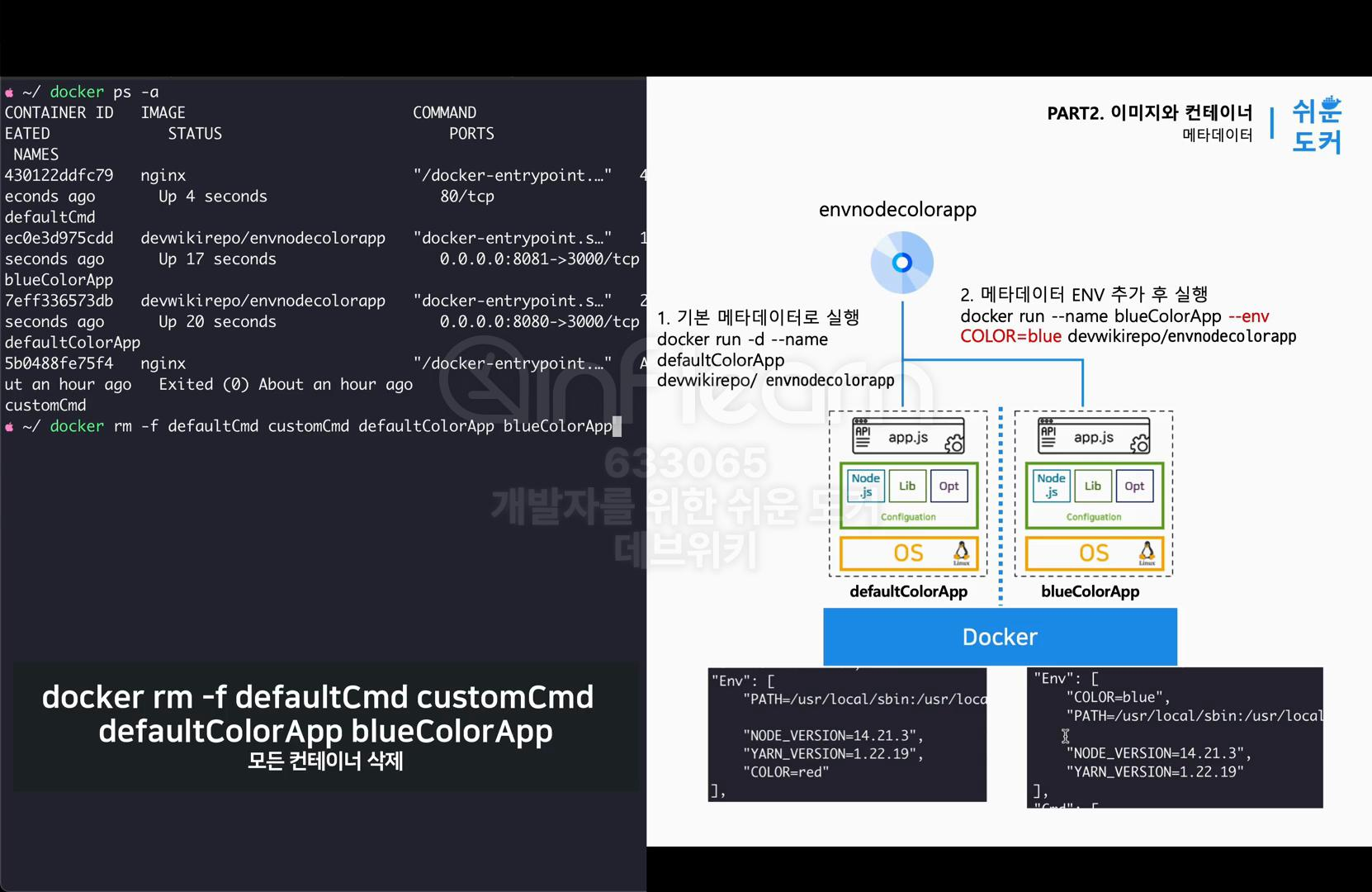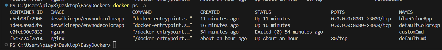 지금까지 실습에 사용된 컨테이너를 확인하기 위해 docker ps -a 명령으로 삭제해야 될 컨테이너를 확인한다. 그리고 docker rm -f defaultCmd customCmd defaultColorApp, blueColorApp 으로 모든 컨테이너를 삭제한다.