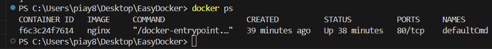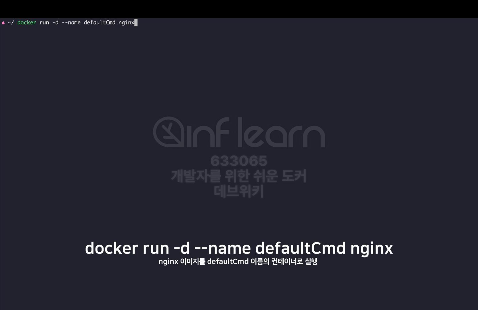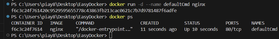 docker run -d --name defaultCmd nginx 으로 nginx 이미지를 defaultCmd 이름의 컨테이너로 실행한다.