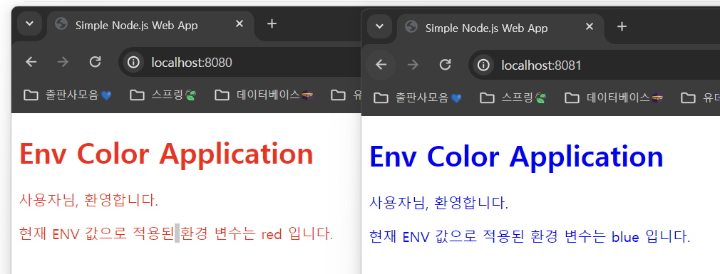 localhost:8080으로 크롬의 시크릿 모드로 실행 중인 defaultColorApp에 접속한다. defaultColorApp에는 Env 필드의 COLOR 값이 red로 설정되어 있기 때문에 글씨 색깔이 빨간색으로 표시되는 것을 확인할 수 있고, localhost:8081에서는 blueColorApp을 확인할 수 있다. blueColorApp은 마찬가지로 Env 필드의 COLOR 값이 blue로 설정되어 있기 때문에 글씨 색깔이 파란색으로 표시되는 것을 확인할 수 있다.