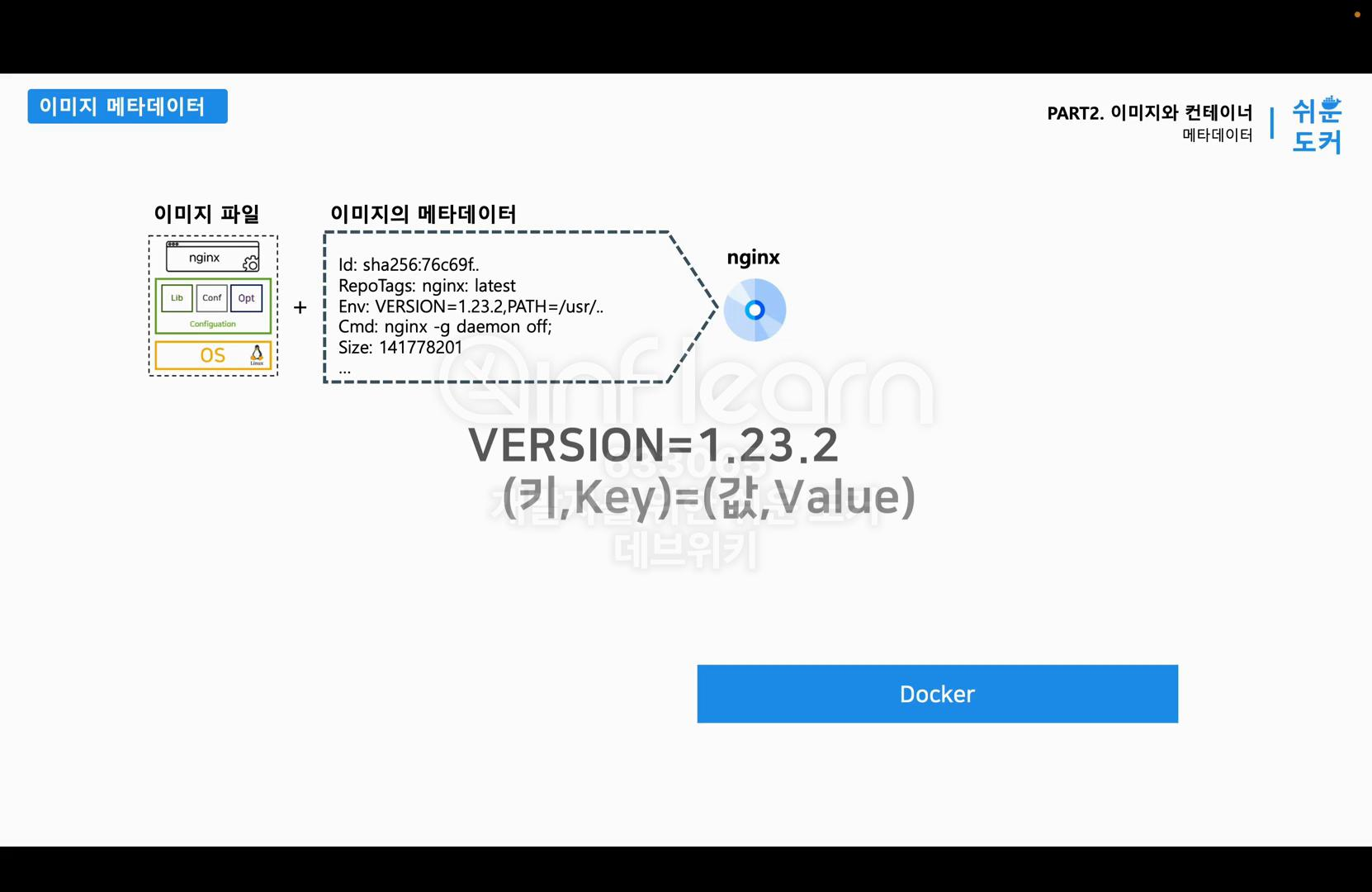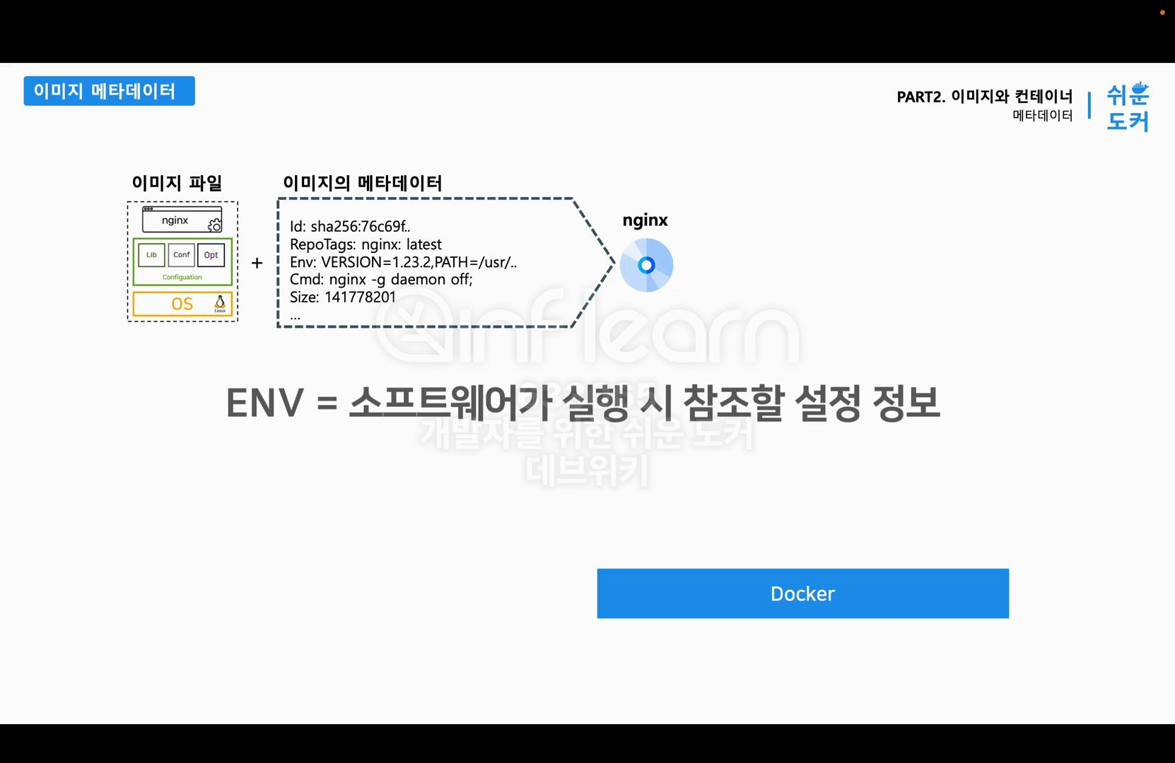Env는 소프트웨어가 실행 시 참조할 설정 정보이다. Env는 애플리케이션이 사용하는 환경 설정 값을 의미하고 키와 값으로 구성되어 있다. 위의 그림에서 이미지의 메타데이터 안에 Env 를 살펴보면 Env: VERSION= 1.23.2 으로 =을 기준으로 키(왼쪽)와 값(오른쪽)으로 나누어져 있는 것을 확인할 수 있다. Nginx 이미지에는 소프트웨어 버전과 Nginx 프로그램을 실행할 때 필요한 파일 경로 같은 정보가 Env 안에 저장되어 있다. 그래서 Env 값이 변경되면 Nginx 는 다른 방식으로 동작할 수 있다.