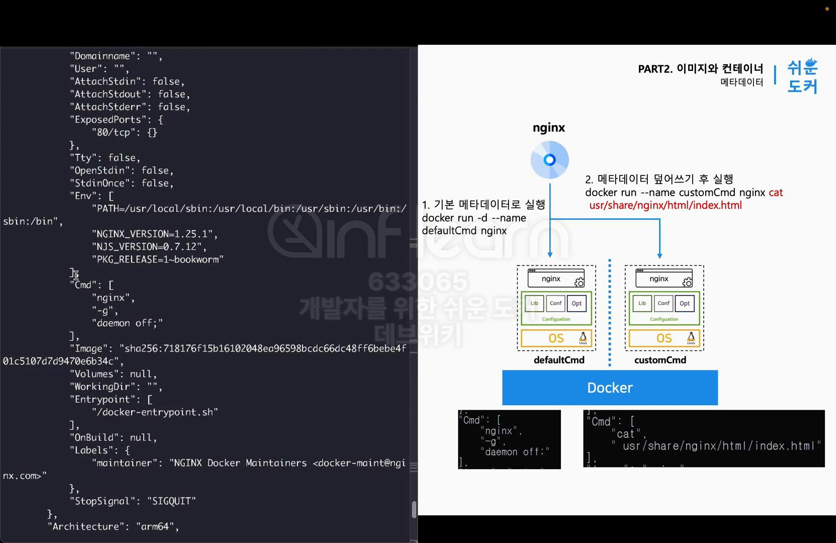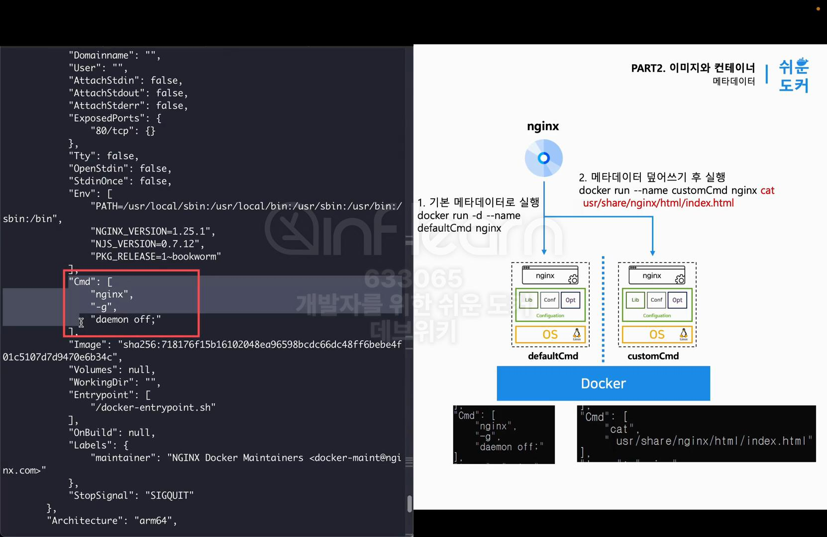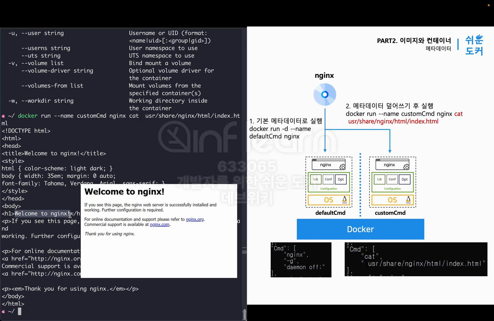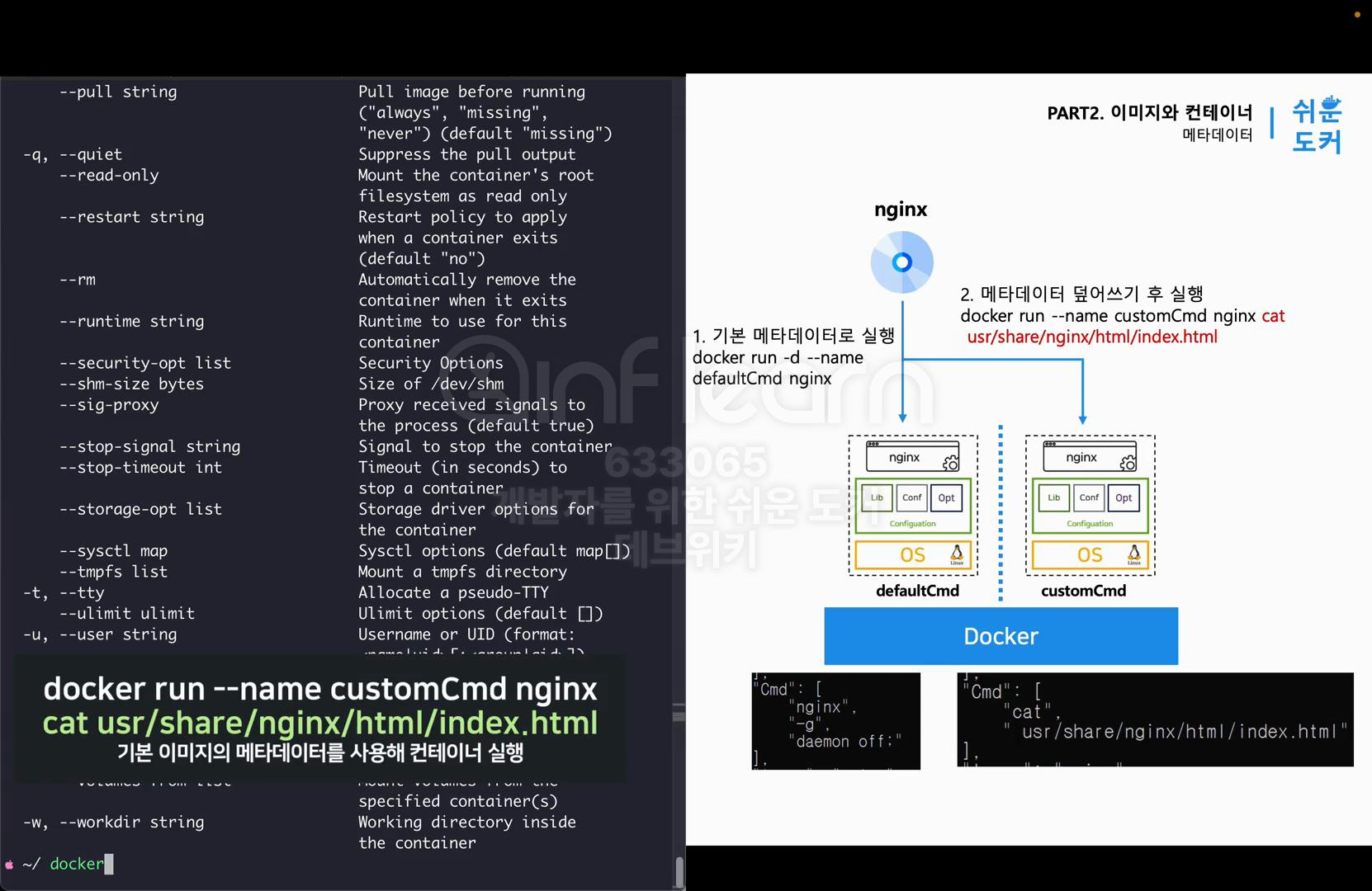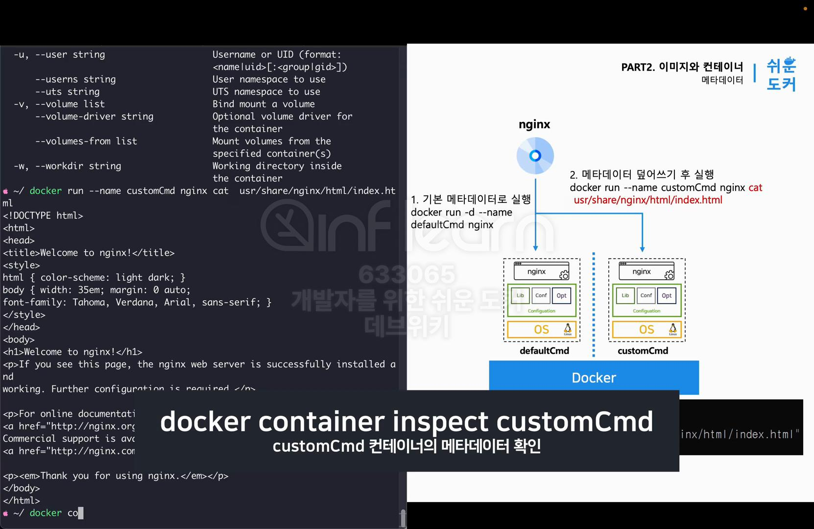 - docker run --name customCmd nginx cat usr/share/ngnix/html/index.html: 기본 이미지의 메타데이터를 사용해 컨테이너 실행