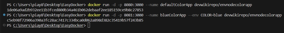 14. docker run -d -p 8081:3000 --name blueColorApp --env COLOR=blue devwikirepo/envnodecolorapp
