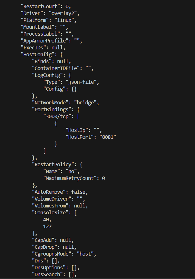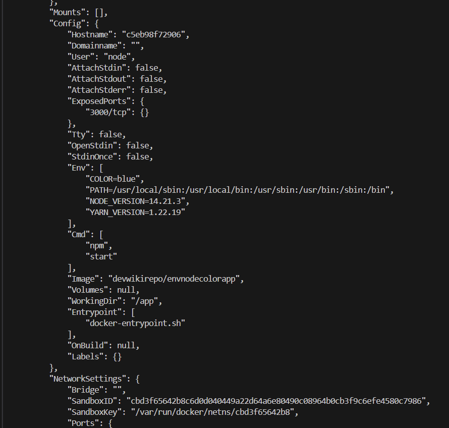 docker run -d -p 8081:3000 --name blueColorApp --env COLOR=blue devwikirepo/envnodecolorapp 으로 두번째 컨테이너도 실행했다. 그리고 blueColorApp 컨테이너의 메타데이터를 확인하기 위해 docker container inspect blueColorApp 명령을 수행한다.