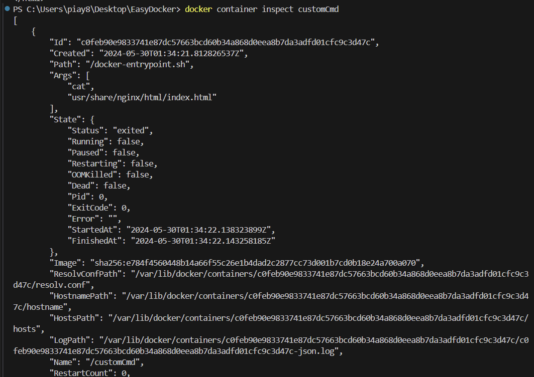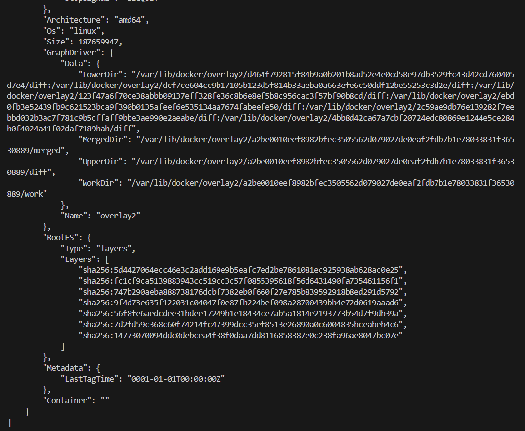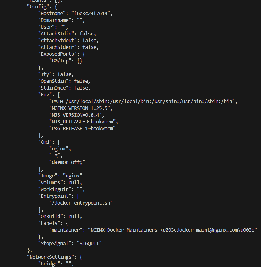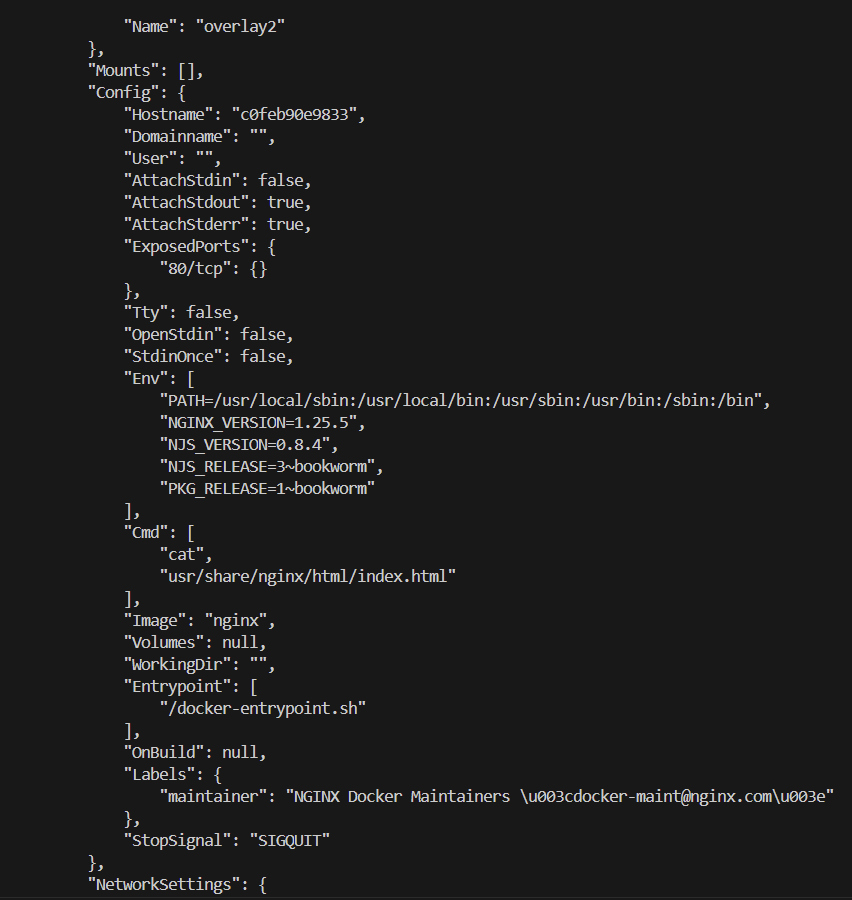 어떠한 수정도 없이 Nginx 이미지를 그대로 컨테이너로 실행하면 Nginx 서버는 요청을 받았을 때 usr/share/nginx/html/index.html 폴더 안에 있는 index.html 파일을 응답해주는 것이라고 볼 수 있다. 이제 실행된 컨테이너의 메타데이터를 살펴보자.