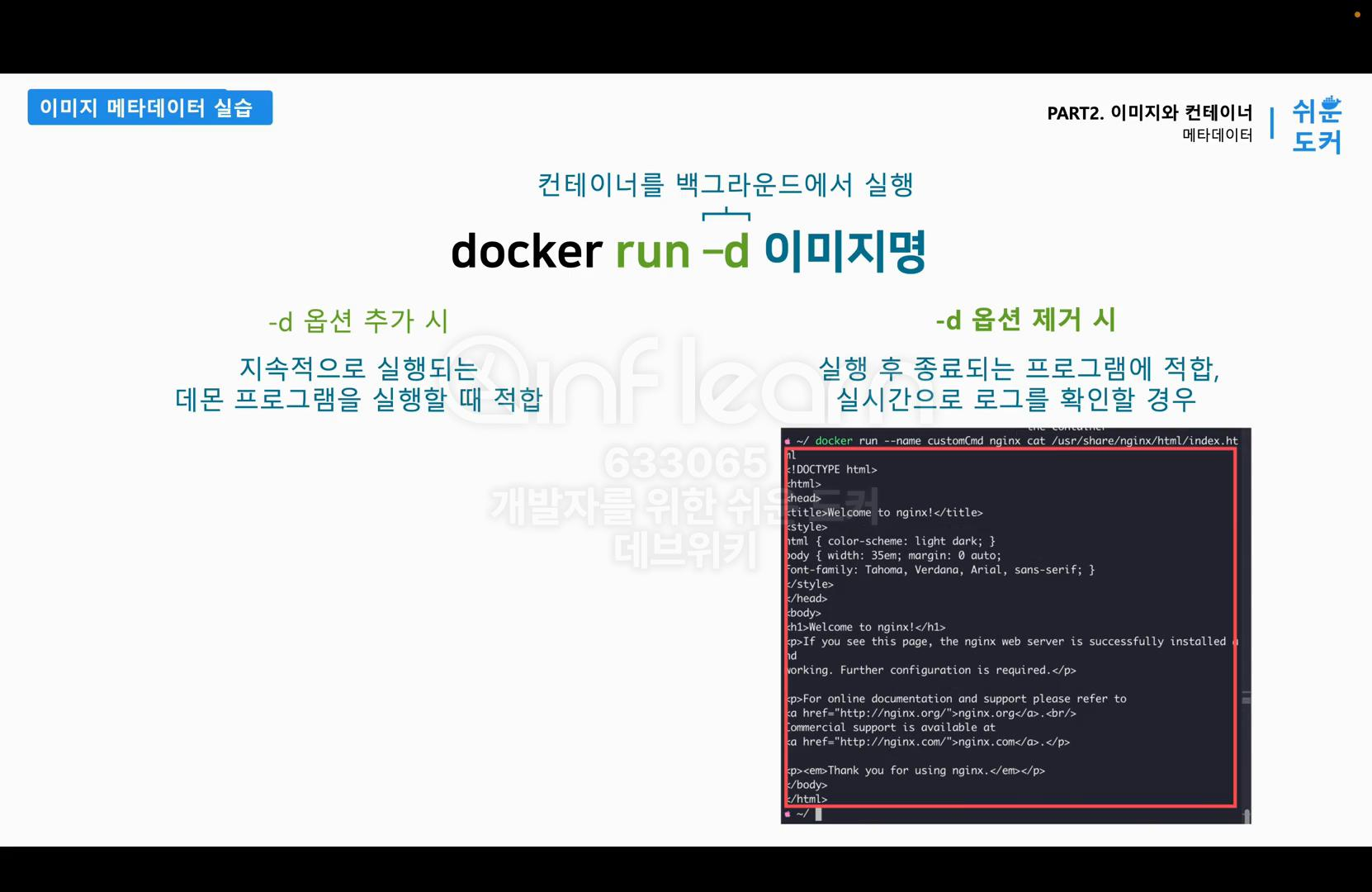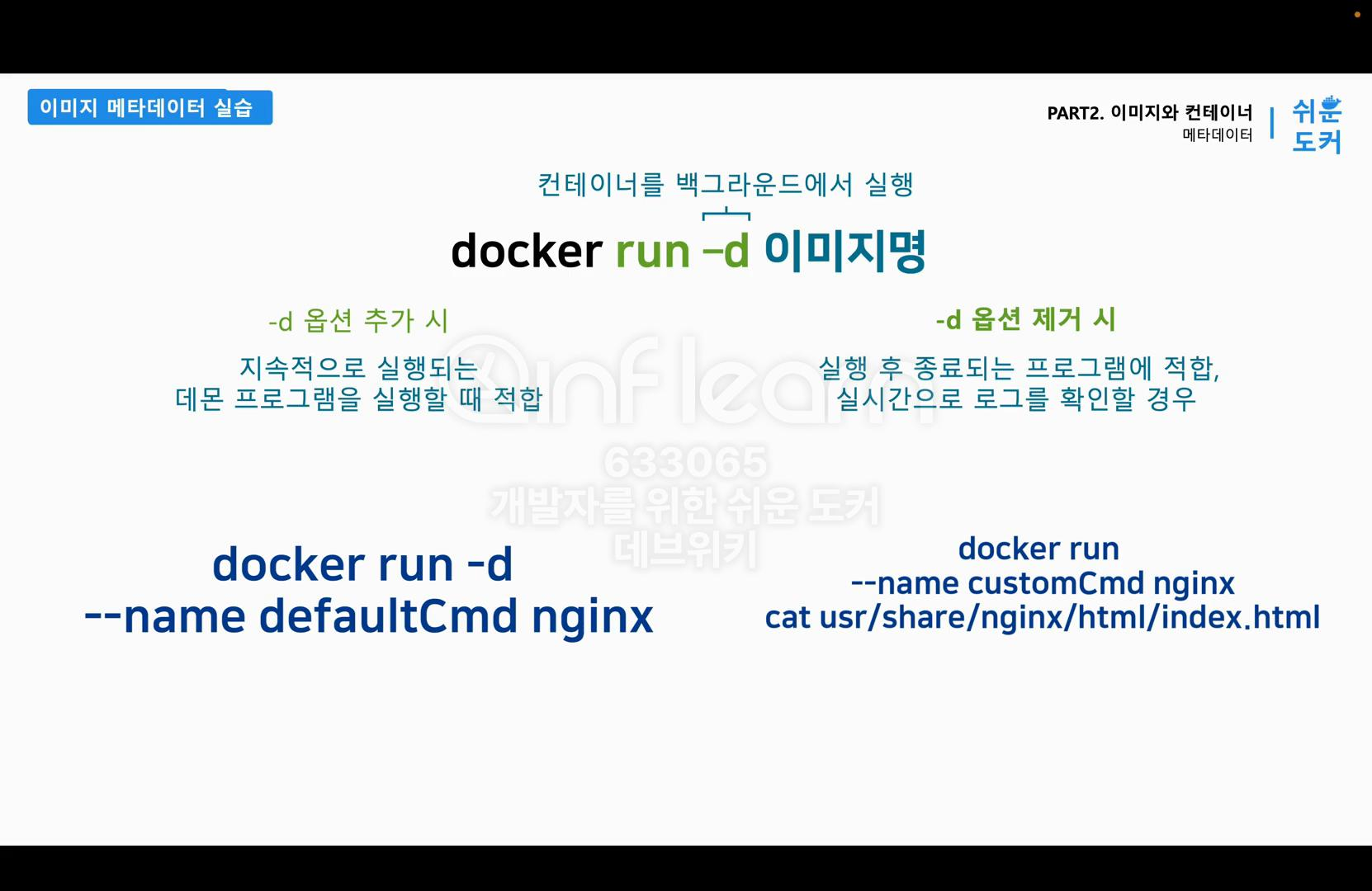 docker image inspect nginx 명령을 실행하면 위의 그림처럼 Nginx 이미지 Cmd의 페이드는 동일하게 유지가 되어 있는 것을 확인할 수 있다. 따라서 변경할 수 있는 것은 이미지를 복사해오면서 실행하는 시점에 컨테이너의 메타데이터만 변경할 수 있다. 다음으로 docker run 명령과 함께 사용한 -d 옵션에 대해 학습한다.