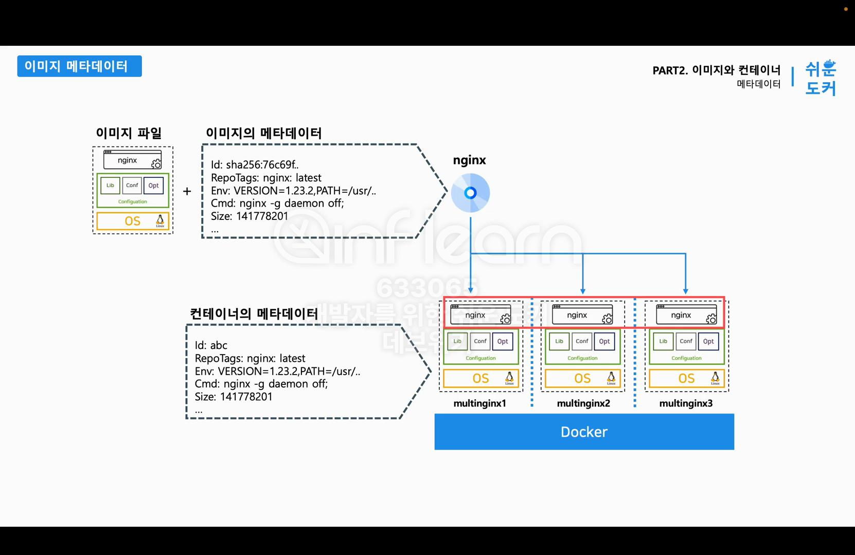 지정한 Nginx 이미지의 압축 파일과 이미지의 메타 데이터를 사용해서 격리된 공간인 컨테이너가 생성된다. 이 시점에서 이제 컨테이너 안에 있는 파일 시스템과 메타데이터는 새롭게 격리되어 있는 공간이고, 이 이미지가 컨테이너로 실행될 때 Cmd 필드에 있는 nginx -g demon off 라는 명령어가 실행이 되는 것이다. 그리고 이 Nginx 같은 프로세스가 실행되면서 Env 필드에 있는 환경 설정 값을 사용할 수 있게 된다.그리고 이 메타데이터는 컨테이너를 실행할 때 새로운 값으로 덮어쓰기 할 수 있다. 이제 실습을 통해서 메타데이터를 덮어쓰기 해 보면서 메타데이터를 테스트해보자.