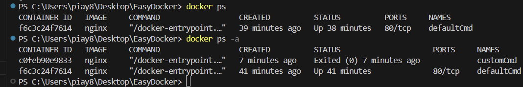 docker container inspect customCmd 를 입력하여 결과를 살펴보면 해당 Cmd 필드의 값이 변경된 것을 확인할 수 있다. 그리고 docker ps 명령을 입력하면 처음에 실행한 defaultCmd만 확인되고 customCmd는 보이지가 않는다. 그 이유는 customCmd 컨테이너에서 실행한 cat 명령은 파일의 내용을 출력하고 종료되는 일회성 프로세스이기 때문에 Cmd 에서 지정한 cat 명령이 종료되는 순간 컨테이너도 함께 종료가 되는 것이다. customCmd 는 종료된 상태의 컨테이너이기 때문에 일반적인 docker ps 명령으로는 조회가 되지 않고, -a 옵션을 함께 작성하여 종료된 컨테이너까지 모두 확인해야 한다. -a 는 all 을 의미한다.
