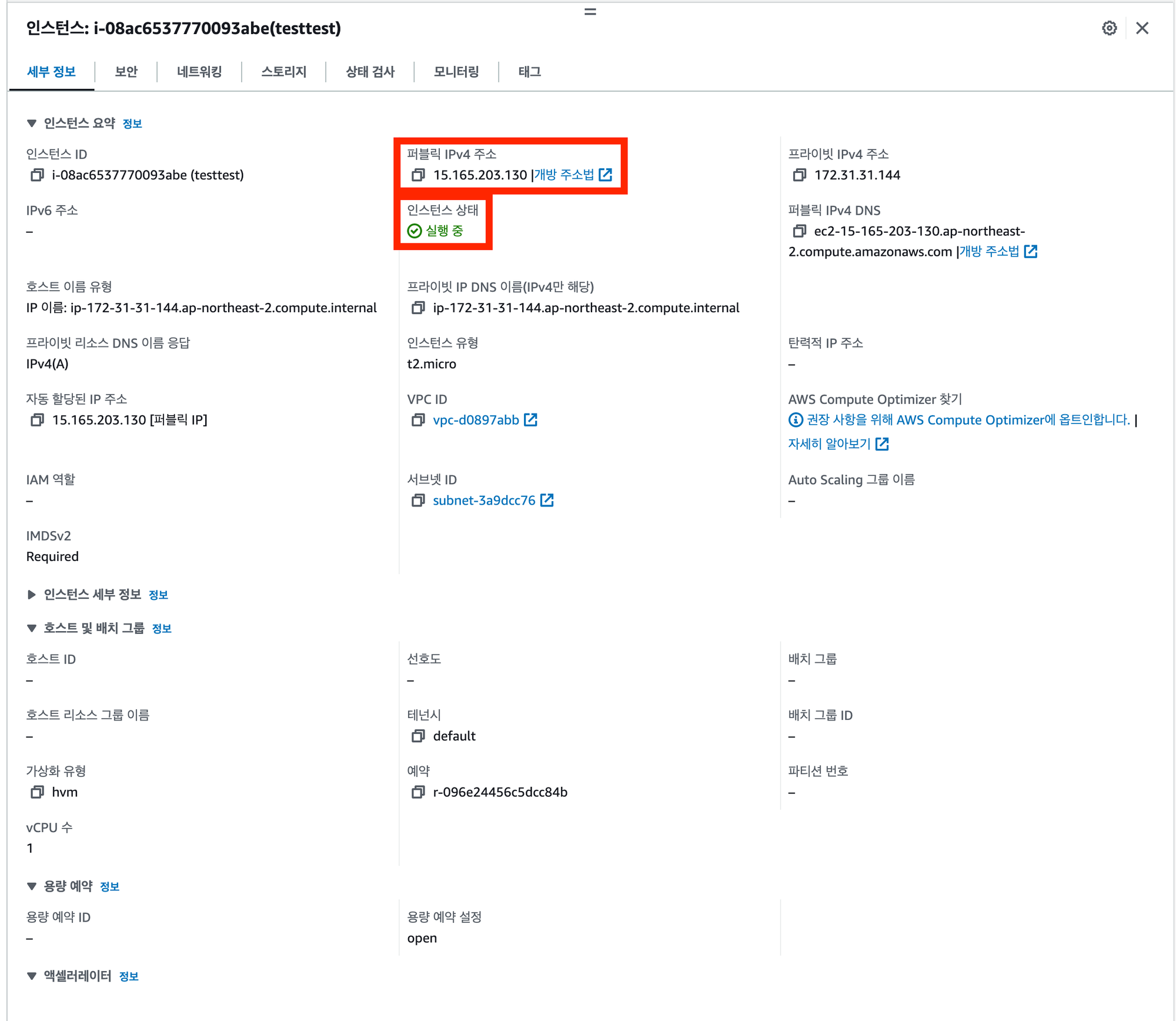 세부 정보에서 눈여겨 봐야 할 부분은 2가지 밖에 없다. 퍼블릭 IPv4 주소와 인스턴스 상태이다.
