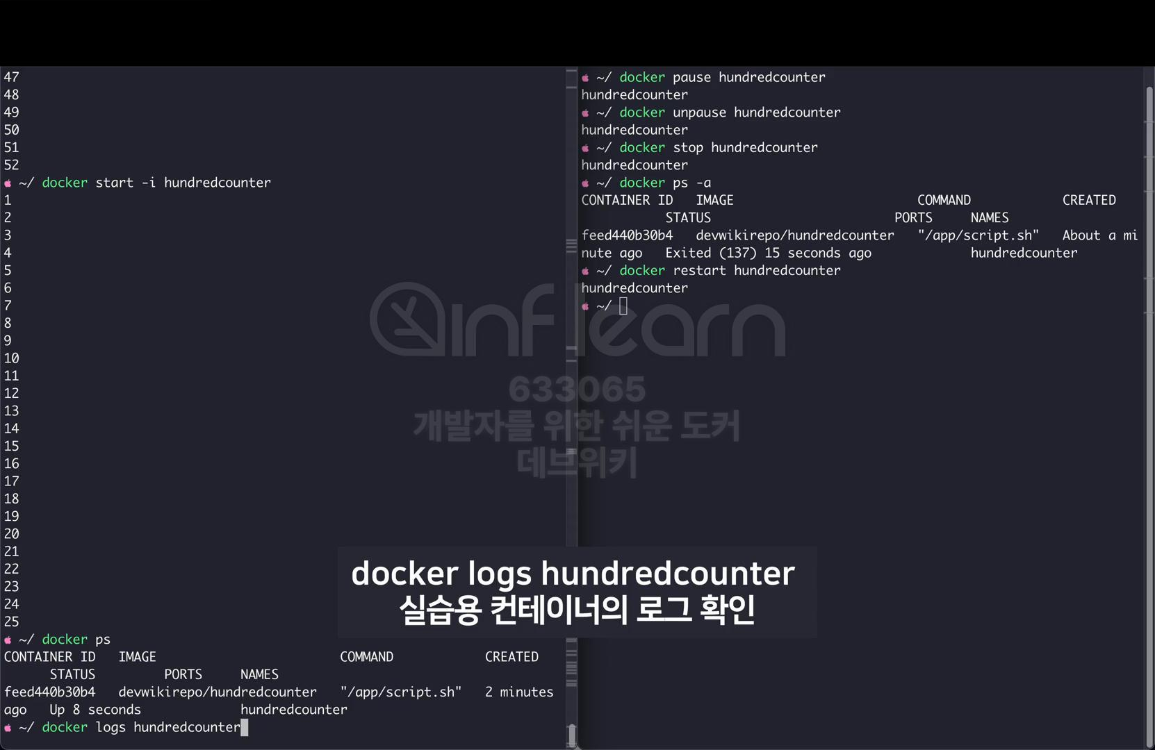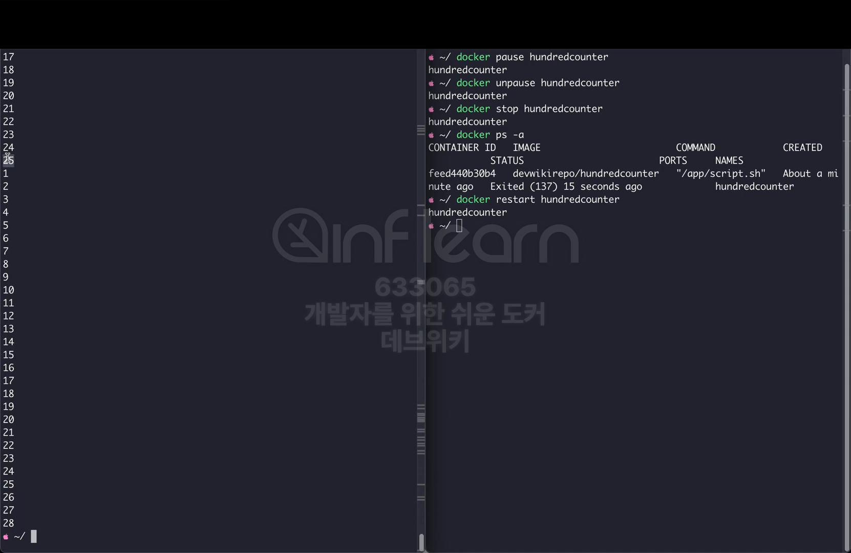 docker stop에 hundredcounter를 입력하면, 프로세스의 종료 명령을 전달한다. 이 종료 명령이 실행 중인 프로세스면 정확히 10초 뒤에 종료한다. 이렇게 stop 명령을 실행하고 10초가 지난 뒤에 프로세스가 종료되는 것을 확인할 수 있다. 여기서 docker ps -a 명령으로 컨테이너의 목록을 출력하면 이렇게 hundredcounter가 종료된 것을 확인할 수 있다. 다시 왼쪽 셸로 이동해서 이번에는 컨테이너를 `docker start -i hundredcounter` 으로 재실행한다.