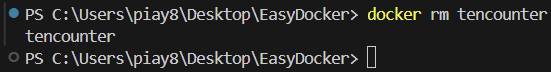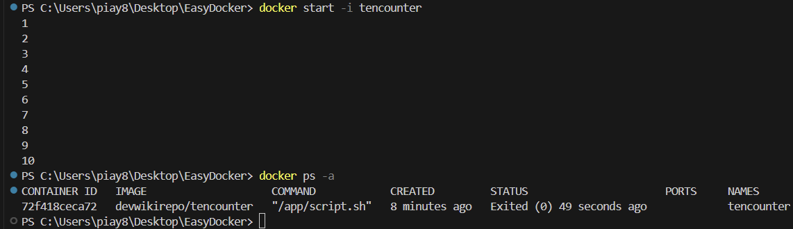다시 docker Start 명령을 입력하자. -i 옵션을 추가하면 컨테이너를 실행함과 동시에 컨테이너의 출력을 바로 터미널로 연결할 수 있다. 그러면 tencounter를 입력해서 docker start -i tencounter으로 엔터를 누르면 이렇게 컨테이너가 실행되면서 로그가 출력되는 것을 확인할 수 있다. 정확히 10까지만 출력되고 프로세스가 종료되는 걸 확인할 수 있다. 그리고 다시 docker ps -a 으로 컨테이너를 확인해 보면 역시 컨테이너가 종료된 상태인 것을 확인할 수 있다. 그러면 이제 docker rm 명령으로 tencounter 컨테이너는 삭제한다.