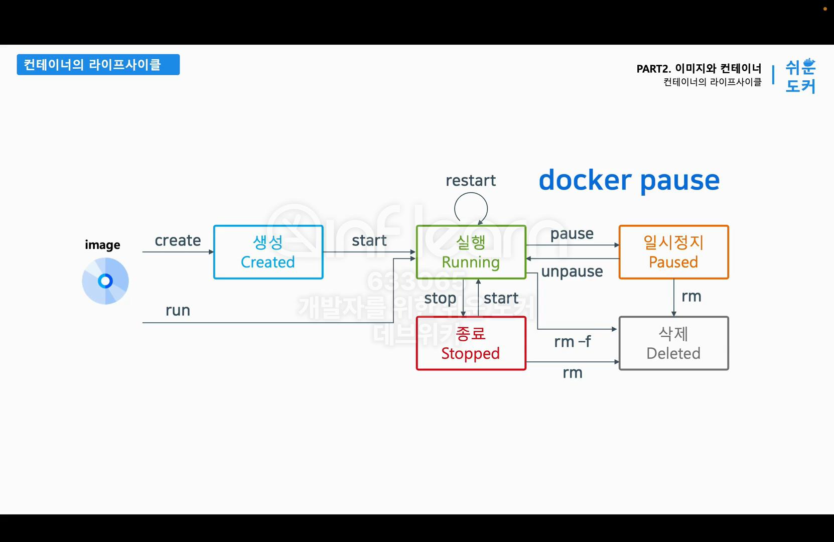 그래서 일시 정지(pause) 상태에서는 CPU는 사용하지 않고 메모리만 사용하게 된다. 그리고 이 상태에서 unpause 명령을 사용하면 프로세스를 일시 정지했던 시점부터 재시작할 수 있다. stopped 상태는 컨테이너에서 실행 중인 프로세스를 완전히 중단시켰다는 것을 의미한다. stopped 상태에서는 메모리와 CPU 사용이 모두 중단된다. 종료된 컨테이너를 다시 시작하면 컨테이너의 프로세스가 처음부터 다시 실행된다. 그리고 이 컨테이너는 모든 상태에서 rm 명령을 사용해서 삭제할 수 있다. 다만 실행 중인 컨테이너를 삭제하려면 이전에 실습했던 것처럼 -f 옵션을 사용해야 한다.