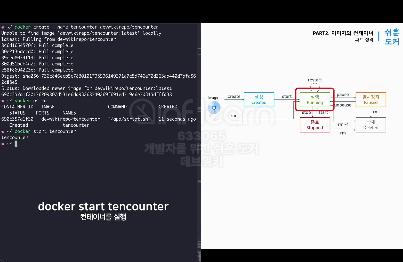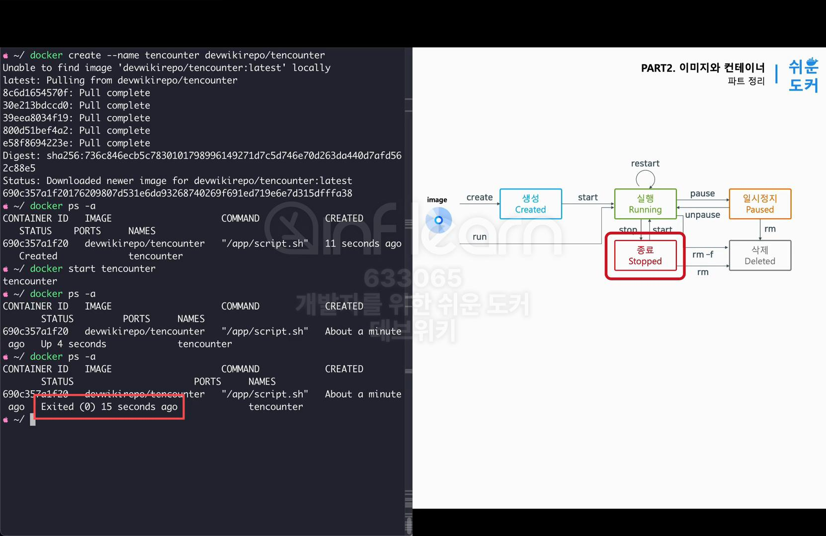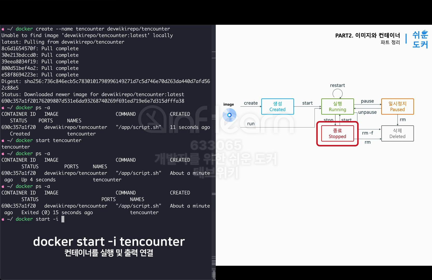 지금 create 상태에서는 CPU나 메모리를 사용하지 않고 오로지 격리된 공간만 만들어진 상태이다. 이제 이 상태에서 docker start 명령을 사용해서 tencounter를 실행한다. 그리고 docker ps -a로 확인해 보면 이렇게 실행 중인 상태인 up 인 것을 확인할 수 있다. 그런데 이 tencounter는 10초 뒤에 종료되기 때문에 조금 기다렸다가 다시 docker ps -a 명령으로 확인해 보면 tencounter 컨테이너가 Exited, 종료된 상태인 것을 확인할 수 있다.