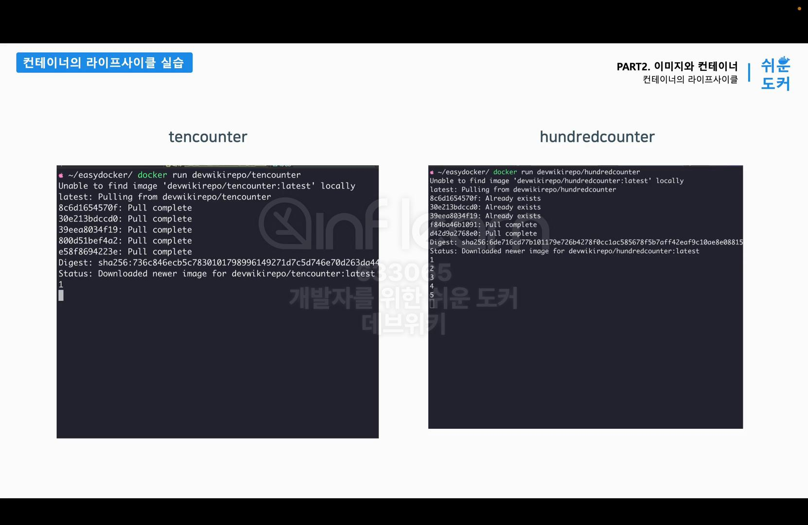 다음으로 hundredcounter를 실습하자. hundredcounter 는 파워 쉘을 하나 더 띄우고 두 개의 쉘로 테스트를 한다. 이렇게 양쪽에 커맨드 창을 띄우고, 먼저 왼쪽 커맨드 창에서 hundredcounter 를 실행한다. docker run --name 으로 hundredcounter라고 입력한다. devwikirepo 에 hundredcounter를 입력하고 엔터를 눌러서 수행한다. 역시 이미지가 다운로드 되는 것을 확인할 수 있다. 이번에는 -d 옵션을 주지 않았기 때문에 이렇게 1부터 100까지 출력되는 것을 확인할 수 있다.