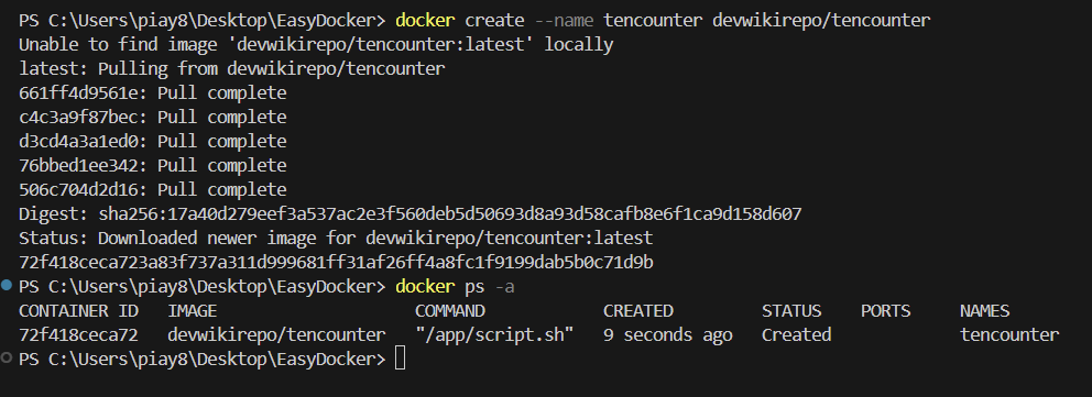docker logs 뒤에 컨테이너명을 입력하면 실행 중인 컨테이너의 로그를 확인할 수 있다. 먼저 docker create 명령을 사용해서 컨테이너를 생성 상태로 만들어 보자. docker create --name에 tencounter라고 입력하고, 이미지는 devwikirepo에 tencounter를 지정한다. 이미지를 다운받는 것을 확인하고 완료되면 docker ps -a를 통해서 컨테이너를 확인해 보면 이렇게 tencounter가 create 상태라는 것을 확인할 수 있다.