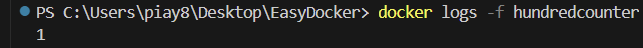 docker logs에 hundredcounter를 입력하면 로그를 이렇게 출력할 수가 있다. 아까 25 상태에서 리스타트가 되었기 때문에 로그가 25 까지 남아있는 것을 확인할 수 있다. 그리고 리스타트를 했기 때문에 다시 1부터 출력이 된 것이다. 그런데 이 로그 명령은 일회성 출력이기 때문에 한 번만 출력되고 종료되는데, 이 로그를 지속적으로 터미널에 띄우려면 docker logs 에 -f 옵션을 추가해서 로그를 계속적으로 출력할 수 있다. 이렇게 docker logs 에 -f hundredcounter 를 입력하고 엔터를 누르면 이렇게 로그가 지속적으로 출력되는 상태를 유지할 수 있다.