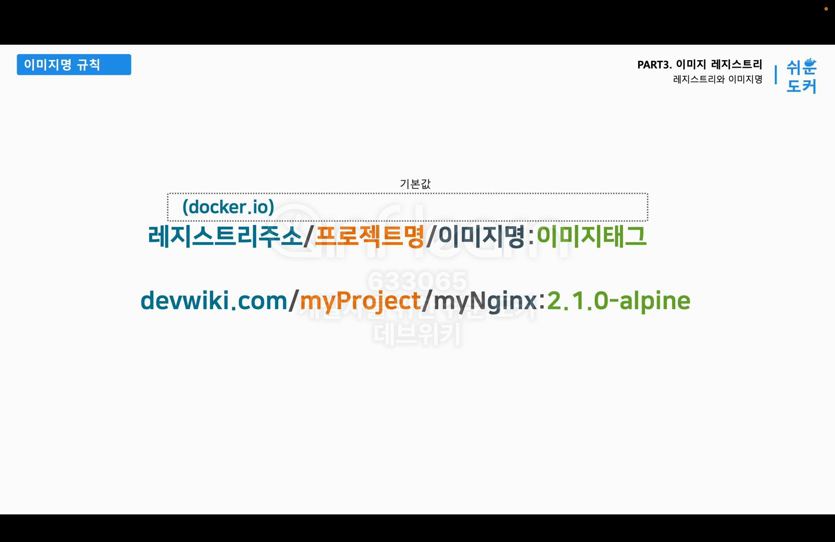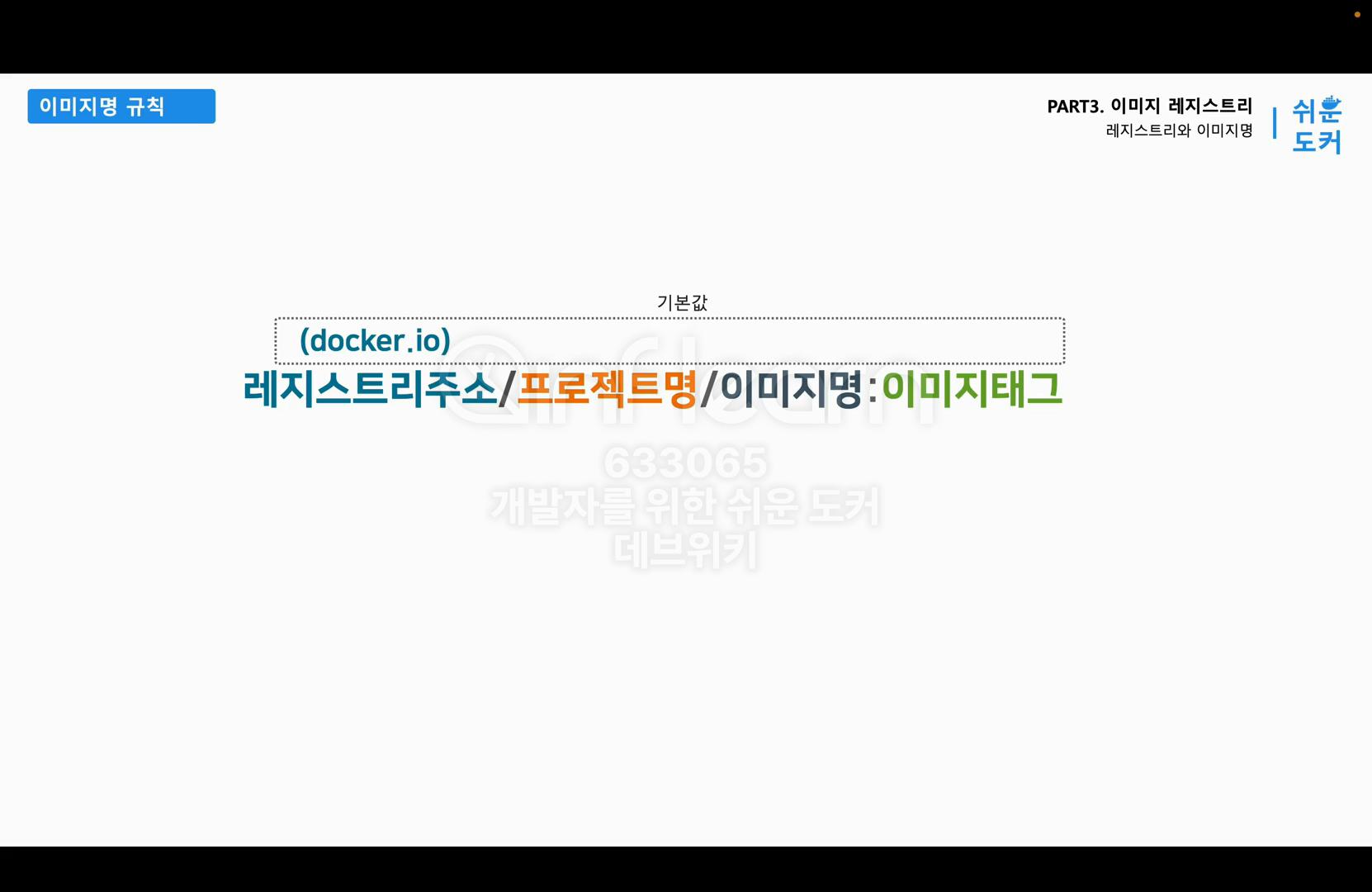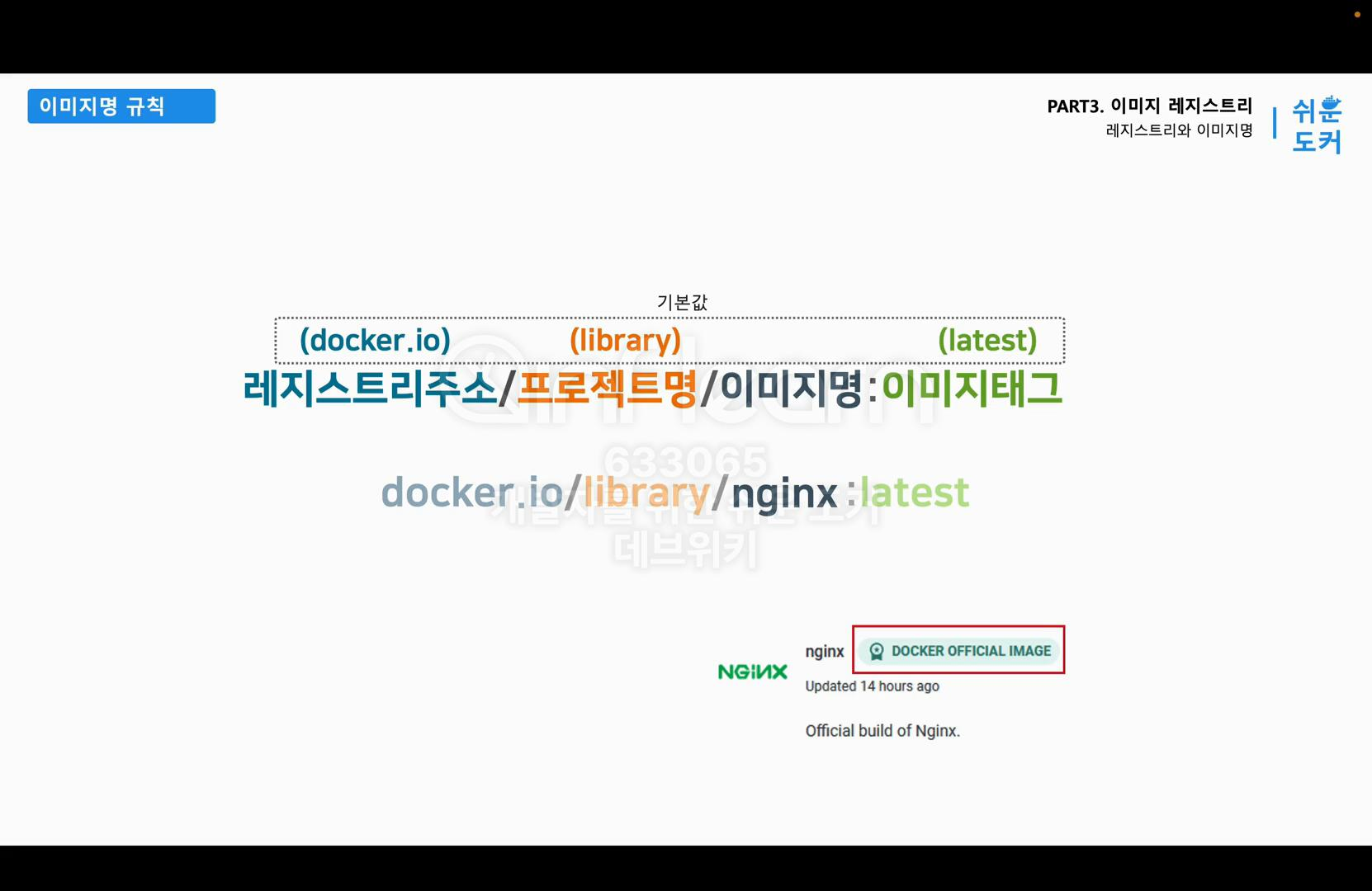 다음으로 이미지의 네이밍 규칙에 대해서 얘기하겠다. 이전에 Nginx를 처음 실행했을 때를 떠올려보자. 화면에 보이는 명령어 docker run -d -p 80:80 --name hellonginx nginx로 컨테이너를 실행했다. 맨 끝에 nginx라는 이미지 이름으로 이미지를 지정했었다. 그런데 보통 이미지 이름에는 이미지를 어디서 다운받는지, 어떤 버전의 이미지를 다운받는지에 대한 정보가 모두 포함되어 있어야 한다. 그런데 실습할 때 nginx라는 이미지 이름만 적었는데도 이미지를 다운로드할 수 있다. nginx라는 이름만 가지고 이미지를 다운받을 수 있었던 이유는 이 이미지 이름에 규칙이 있고 디폴트로 지정되는 기본 값이 있기 때문이다. 이 이미지의 네이밍 규칙은 이미지를 만들고 공유하는 데 있어서 꼭 필요한 정보이기 때문에 꼼꼼하게 알아보도록 하자.