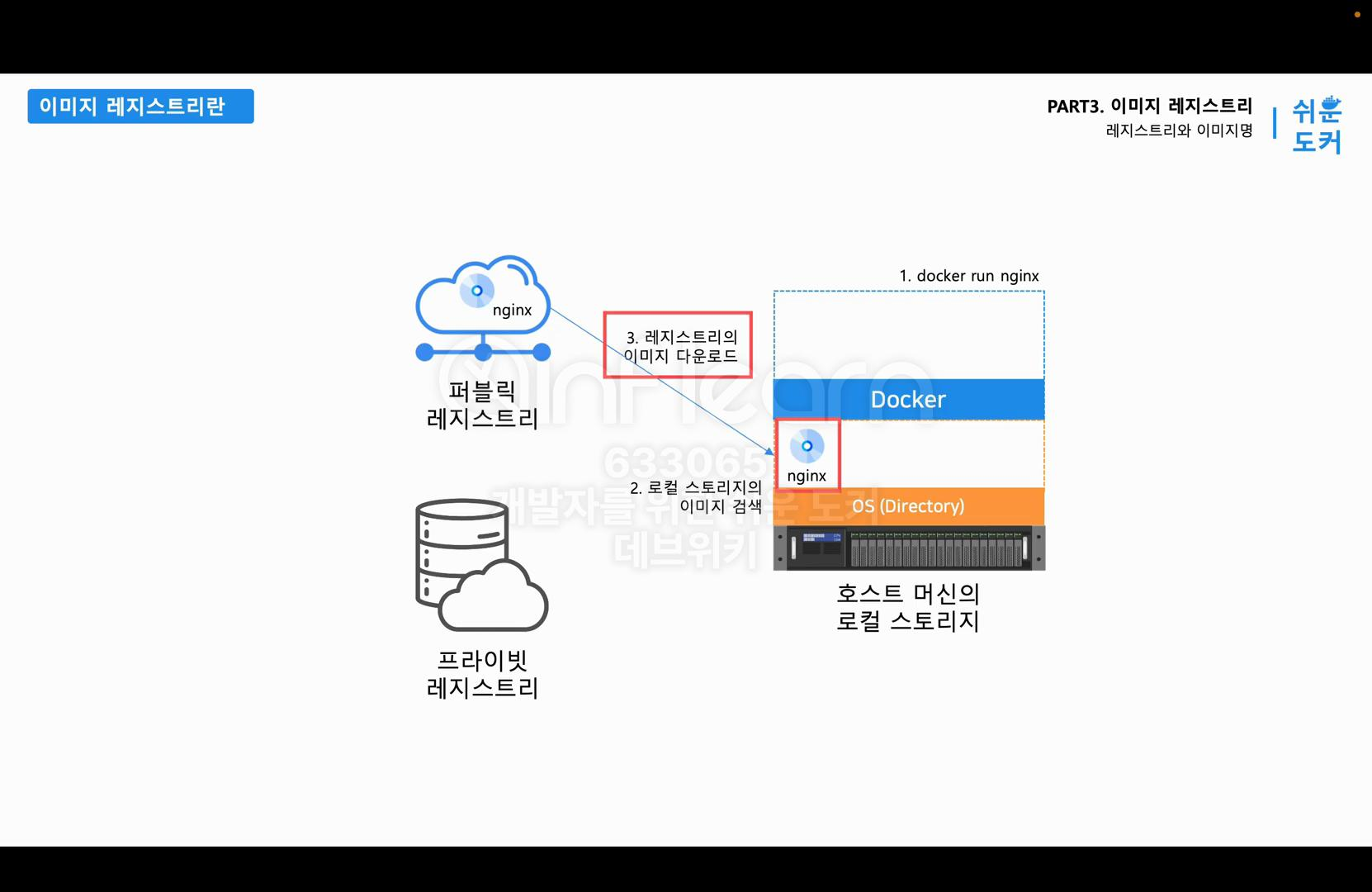 이미지가 저장되는 공간은 크게 세 가지로 분류할 수 있다. 먼저 도커가 설치되어 있는 호스트 머신의 로컬 스토리지이다. 그리고 온라인 저장소는 크게 두 가지 종류로 나눌 수 있는데, 주로 기업에서 많이 사용하는 프라이빗 레지스트리와 도커 허브 같은 퍼블릭 레지스트리가 있다. 컨테이너를 실행할 때 이미지의 이름을 입력했는데, docker run 명령에서 이미지의 이름을 지정하면 먼저 로컬 스토리지에서 해당하는 이미지가 있는지 검색한다. 로컬 스토리지는 도커를 행하는 호스트 OS의 특정 폴더를 의미한다.