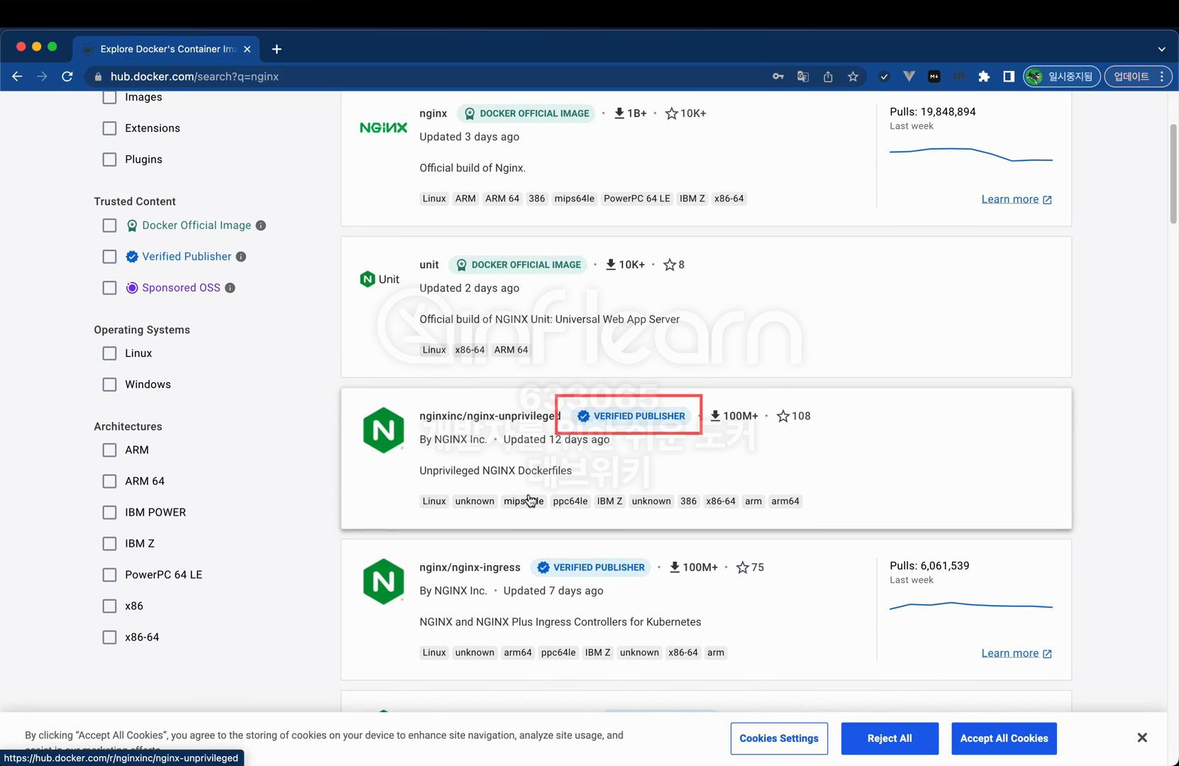 그리고 조금 밑으로 내려 보면 DOCKER OFFICIAL IMAGE 말고도 VERIFIED PUBLISHER라는 태그가 붙은 이미지들이 있다. 이 이미지는 도커에서 직접 관리하는 이미지는 아니지만, 어느 정도 규모가 있는 회사에서 자체적으로 인증한 이미지이기 때문에 다른 이미지보다 더 신뢰할 수 있다고 볼 수 있다.