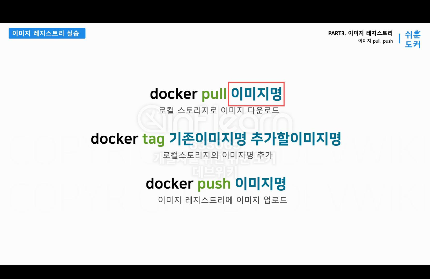 먼저 이미지를 다운로드 받을 때는 docker pull 뒤에 다운로드 받을 이미지의 이름을 입력하면 된다. 여기에 들어가는 이미지의 이름은 이전 시간에 배웠던 이미지의 네이밍 규칙에 따라서 작성해주면 된다. 다음으로 docker tag 명령어는 새로운 이미지명을 만드는 명령어이다. 새로운 이미지명을 만들기 위해서는 새로운 이름을 붙일 원래의 이미지가 있어야 한다. 그래서 docker tag 명령에는 기존에 가지고 있는 이미지명과 새롭게 추가할 이미지명을 입력한다. 원래 있던 이미지는 그대로 둔 상태에서 제가 원하는 이미지명으로 새로운 이름을 하나 만든다고 생각하면 된다. 그리고 마지막으로 docker push 명령 뒤에 이미지의 이름을 입력하면 이미지를 업로드할 수 있다.