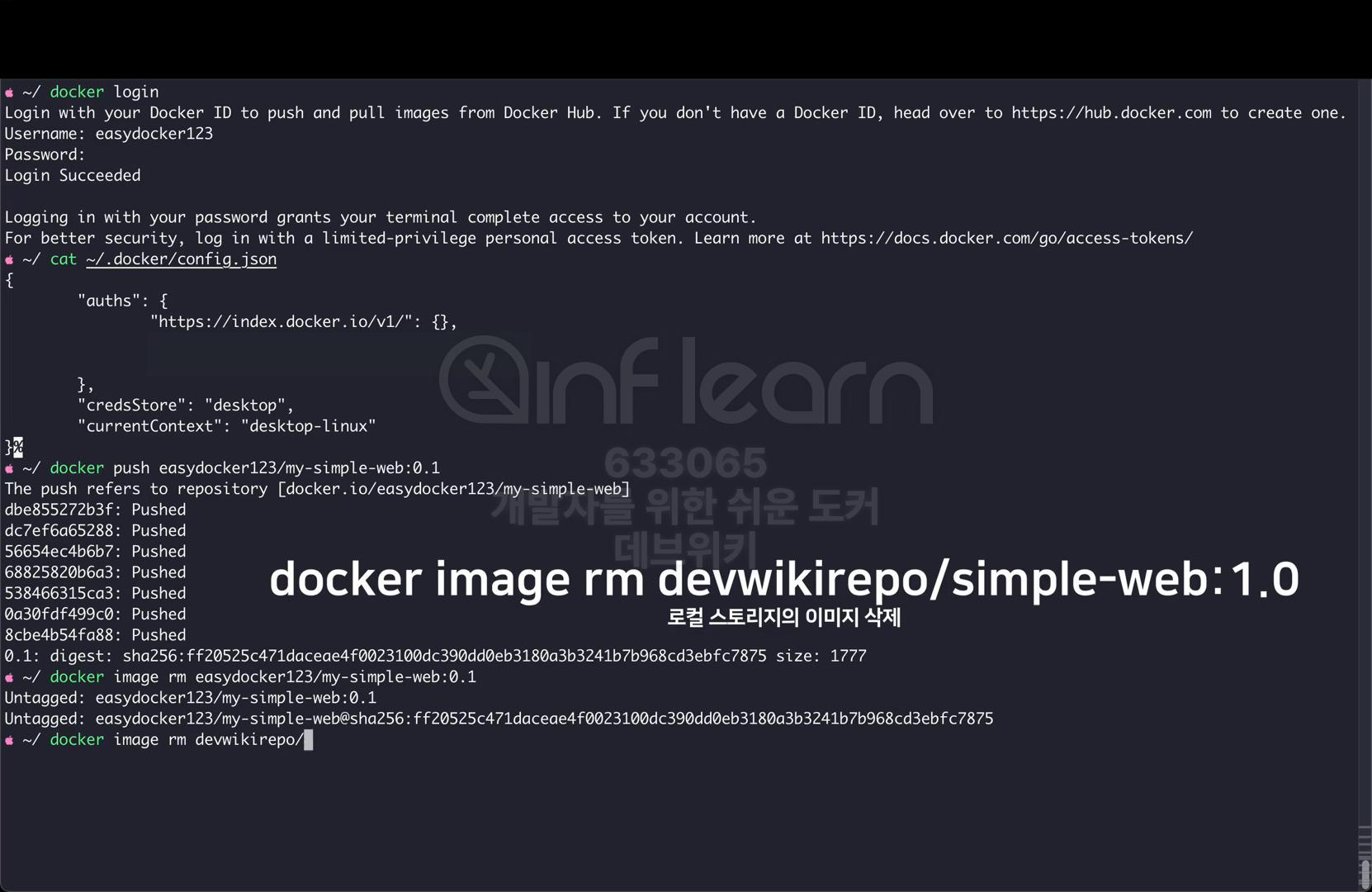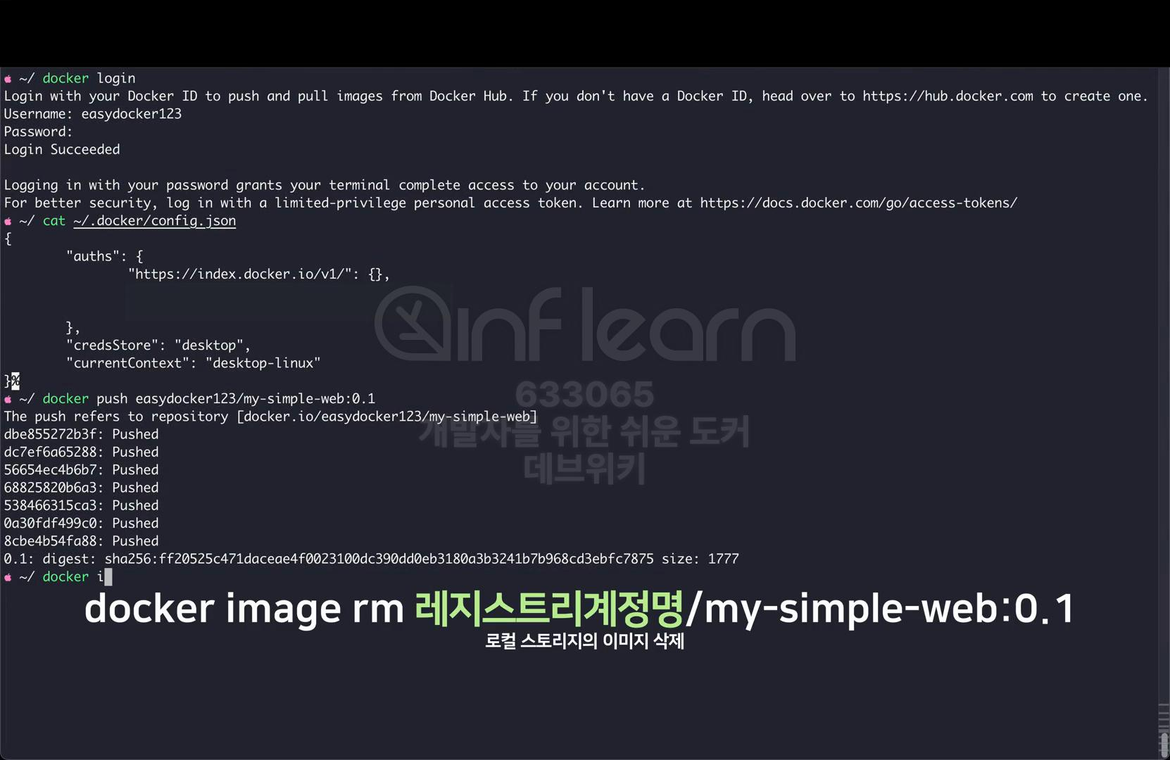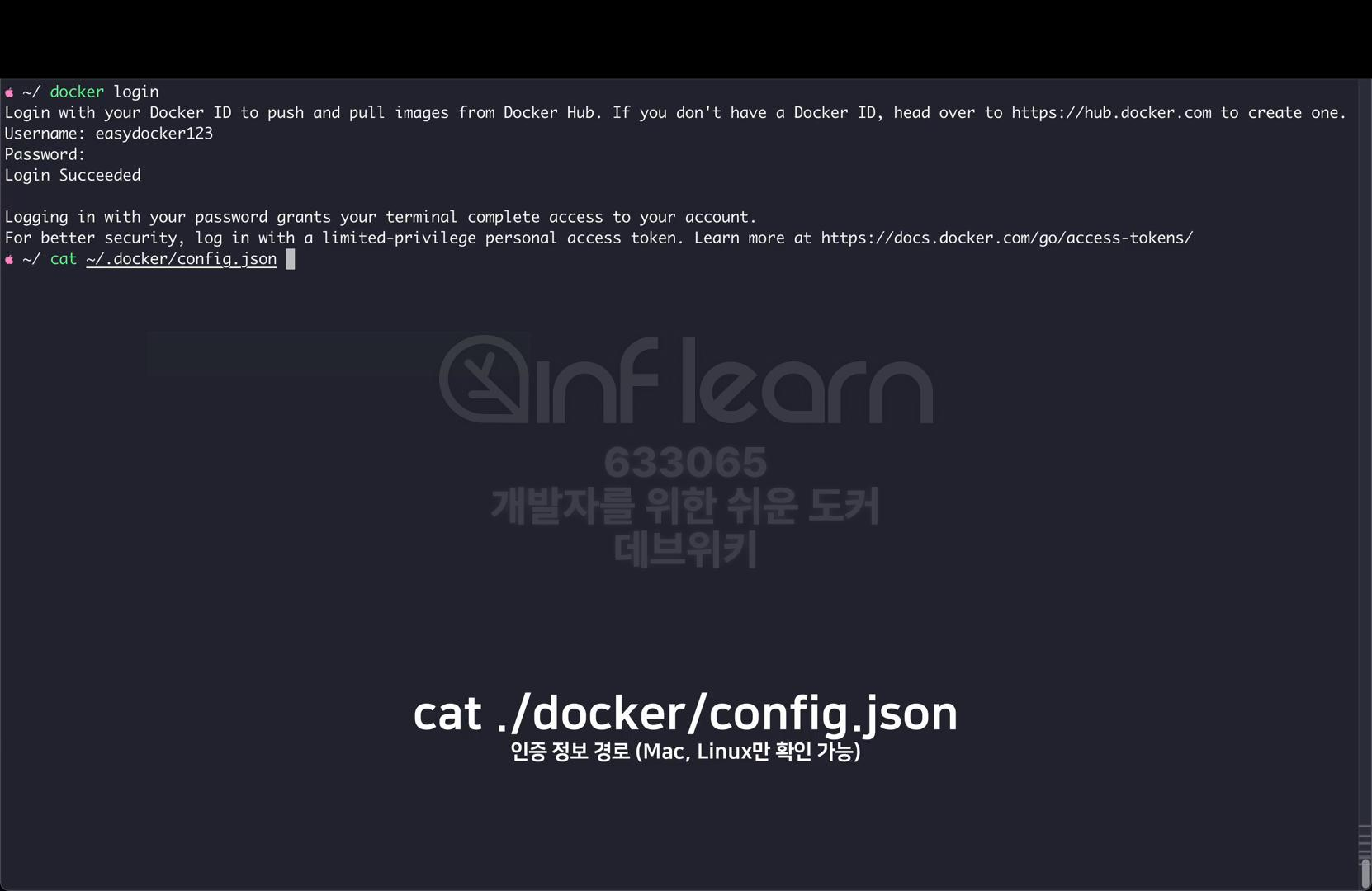 그럼 터미널로 돌아와서 docker login 명령을 사용해 보자. 먼저 docker login을 입력하자. 유저 네임 부분에 사용자의 계정명을 입력한다. 지식공유자 같은 경우는 eazydocker123 을 입력한다. 그리고 비밀번호를 입력하면 정상적으로 로그인이 된 것을 확인할 수 있다. 인증 정보가 저장되는 곳은 OS마다 조금 다를 수 있다. .docker 폴더에 config.json 파일로 저장이 된다. 굳이 꼭 확인을 하진 않아도 된다.