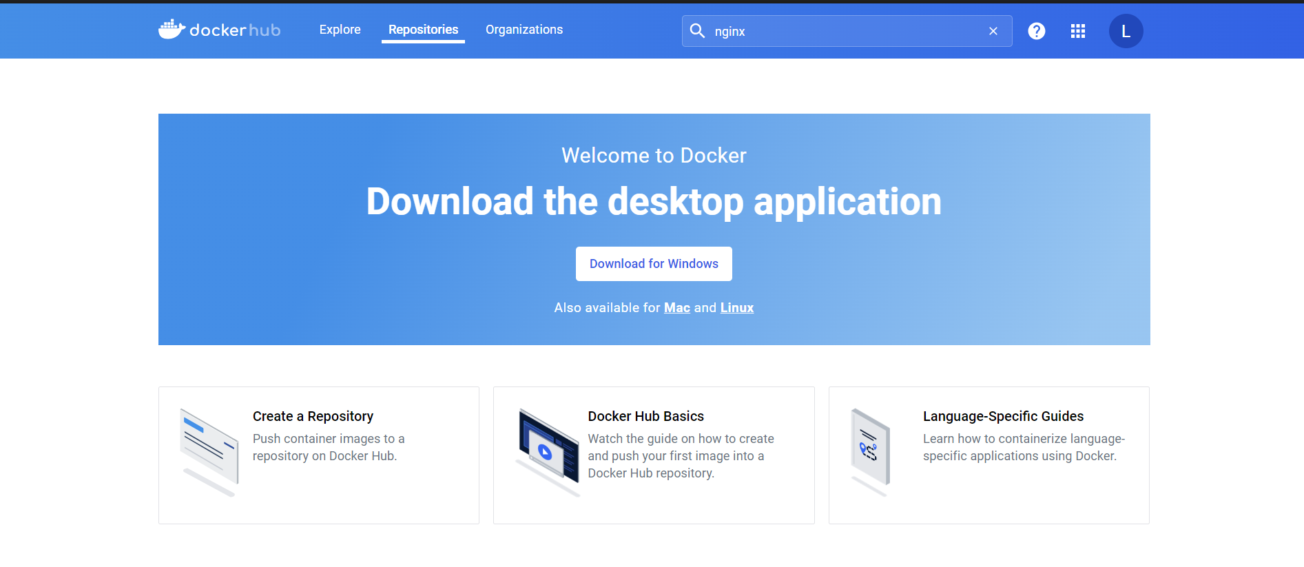 hub.docker.com에 직접 가입하고 이미지를 다운로드하고 업로드한다. docker에서 지원하는 공식 이미지를 확인할 수 있고, 다양한 사용자들이 공유하는 이미지를 볼 수 있다.