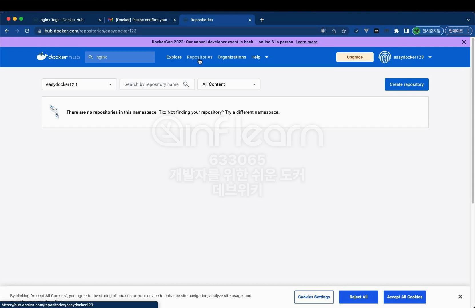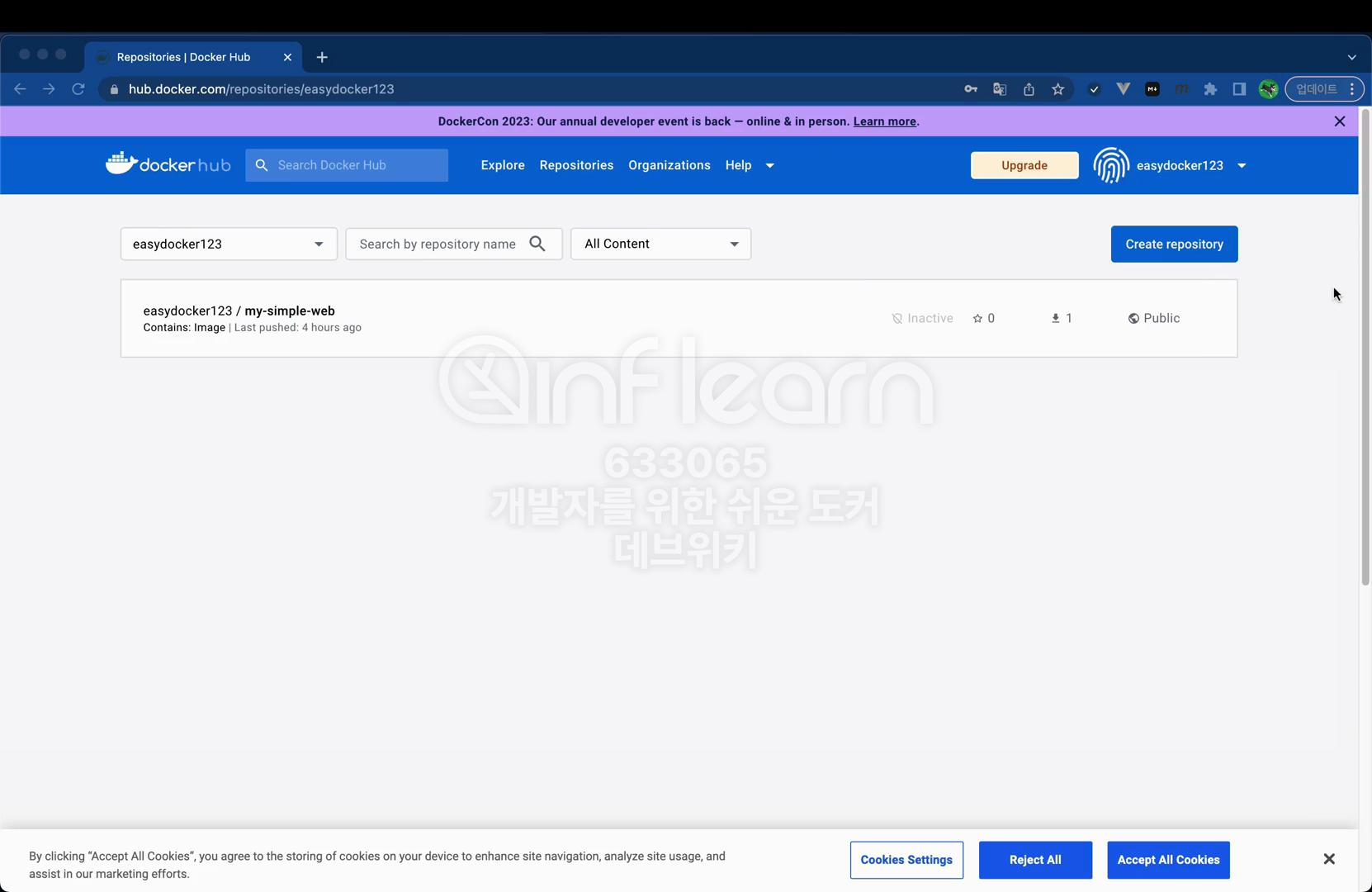 도커 허브는 기본적으로는 무료로 사용할 수 있다. 특정 IP에서 6시간에 100번, 로그인한 사용자는 6시간에 200번 다운로드가 가능하다. 그리고 하나의 계정당 하루에 5,000번의 다운로드 제한이 있다. 개인 용도로 사용하기에는 크게 무리가 없다. 하지만 엔터프라이즈 환경에서는 기업용 라이선스로 구매해서 사용하시거나 설치형 레지스트리를 활용하는 방법도 있다. 이제 여러분의 도커 허브 계정으로 이미지를 직접 업로드해 보자.