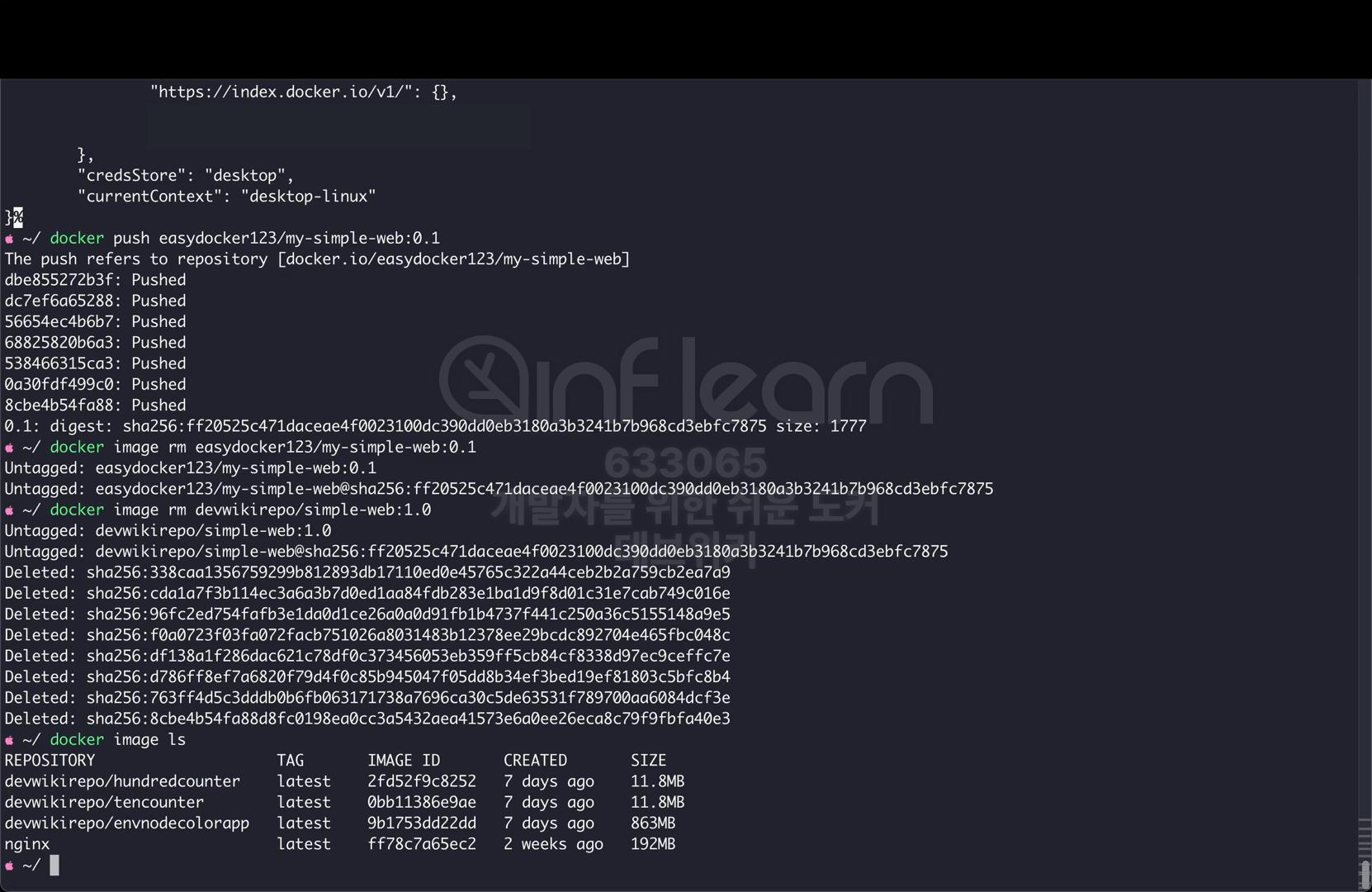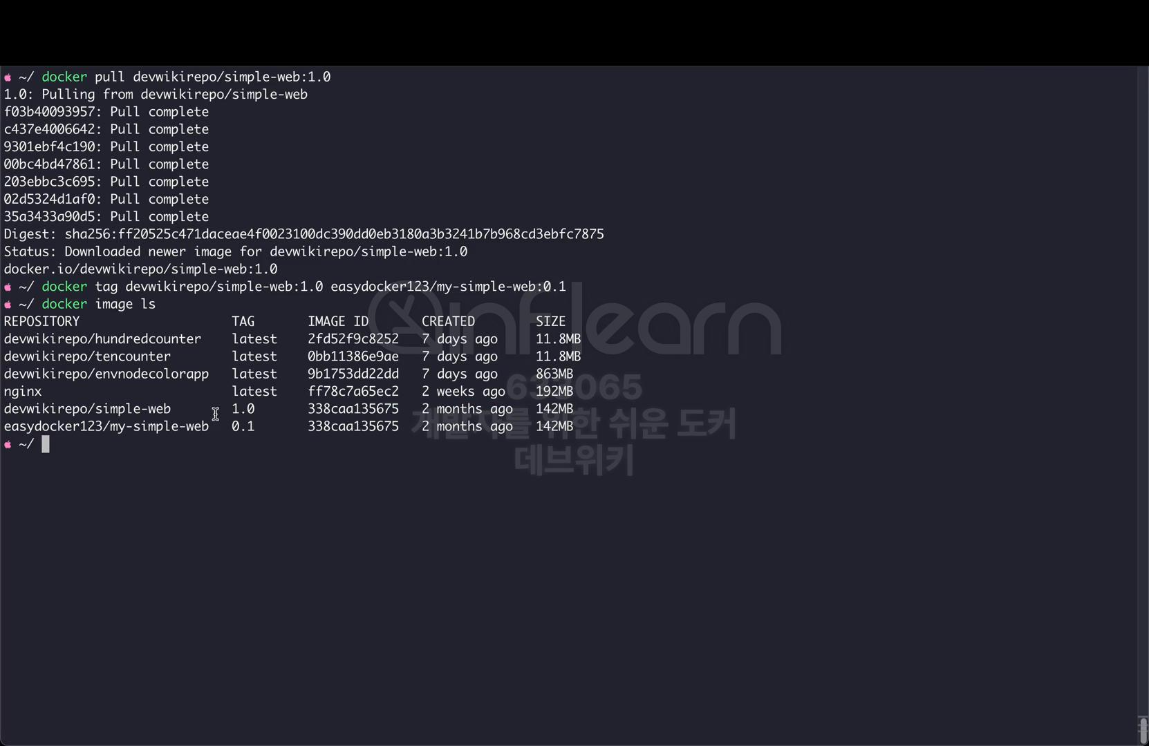 이제 docker image ls 명령을 사용해 보면 my-simple-web 관련 이미지가 로컬 스토리지에서는 모두 제거된 것을 확인할 수 있다.