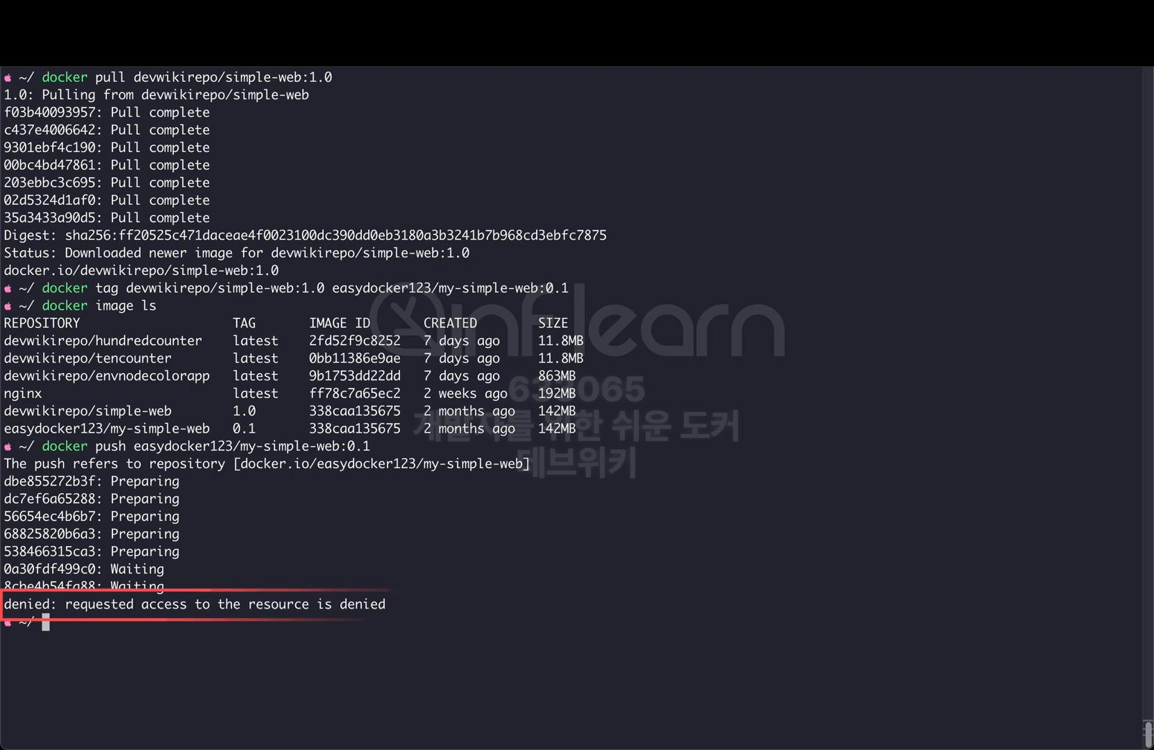 docker push의 레지스트리 계정명에 my-simple-web:0.1 버전을 지정하자. 이렇게 엔터를 치면 push가 시작되다가 인증 관련 에러가 나면서 종료되는 것을 확인할 수 있다.