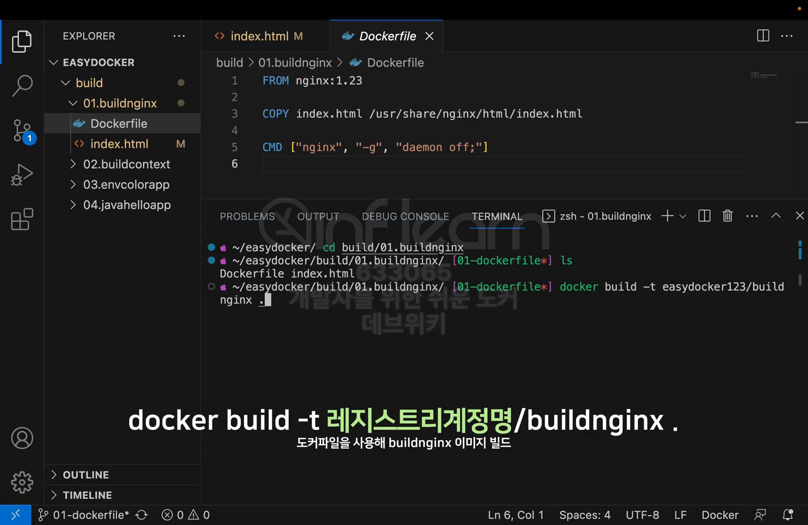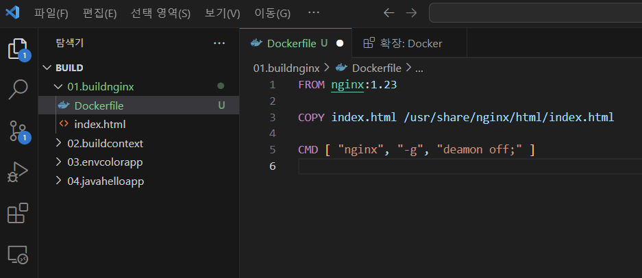 도커 파일 작성을 위해서는 dockerfile 파일을 생성해야 한다. 실습 파일은 github에서 clone 받아서 수행하자. 01.buildnginx 파일 안에 Dockerfile 파일을 생성하고 안에 그림과 같이 작성한다.