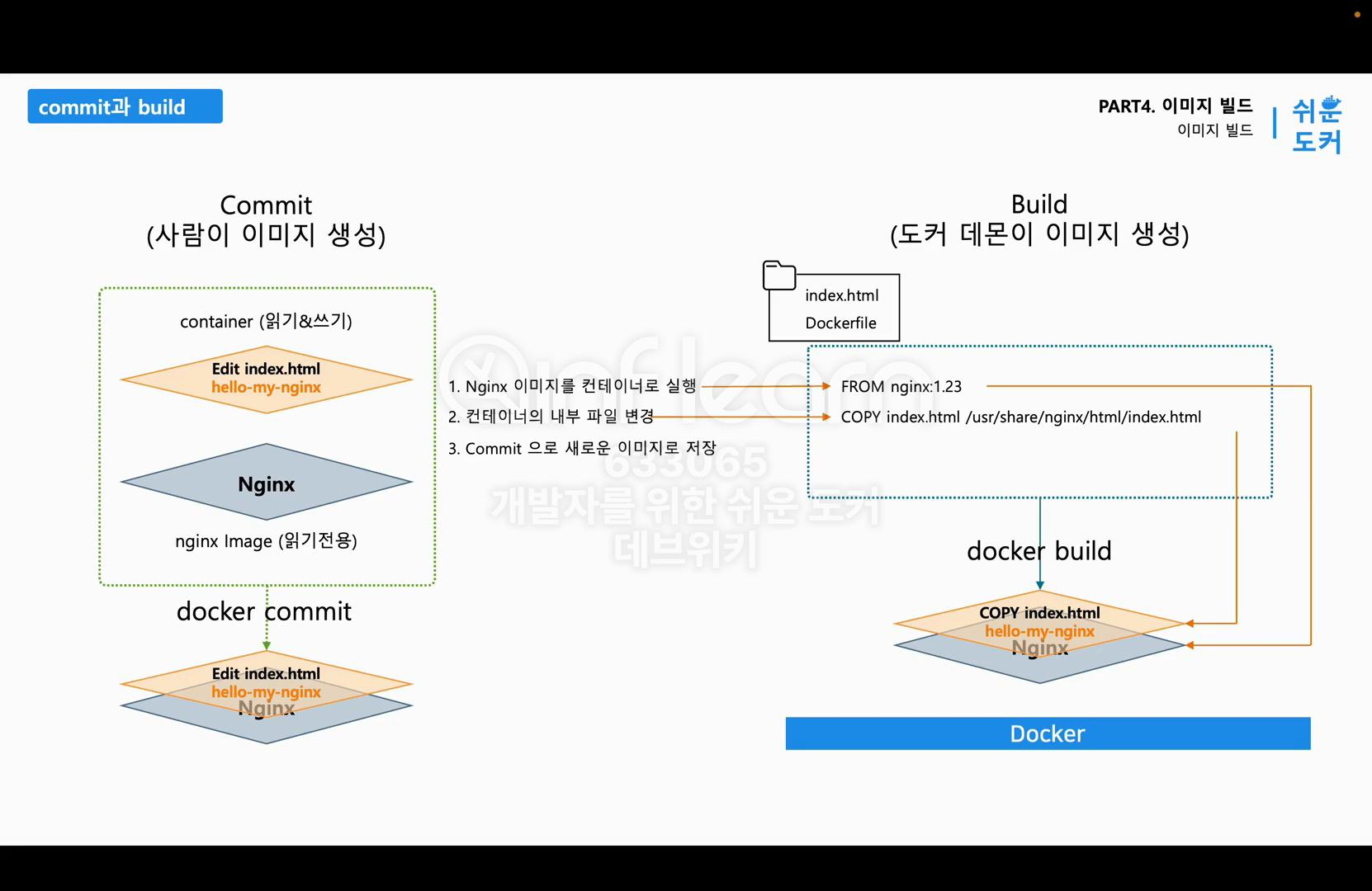 커밋은 사용자가 직접 새로운 이미지를 만드는 방식이고 빌드는 도커 데몬이 도커파일에 작성된 코드에 따라서 새로운 이미지를 자동으로 생성하는 방식이다. 도커 빌드는 IaC 개념으로 인프라의 상태를 도커파일이라는 코드로 관리가 가능하다. 커밋 빌드에서 사용자가 직접 수행했던 일들을 도커파일 안에 지시어를 작성하고 도커 데몬에게 빌드를 위임한다. 도커파일을 사용하면 여러 개의 레이어 구조를 활용할 수 있다.