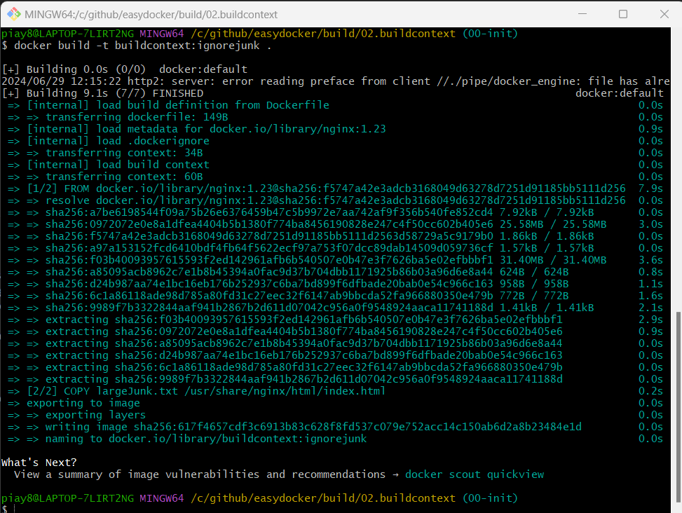 위에서 발생한 에러는 정상적이다. 빌드 컨텍스트에 존재하지 않기 때문에 COPY 지시어에서 에러가 발생하는 것이다. 왜냐하면 dockerignore 안에 largeJun.txt 파일이 작성되어 있기 때문이다. 이제 dockerignore 파일 안에 내용을 지우고 다시 빌드를 수행해보자.