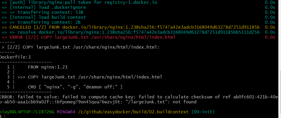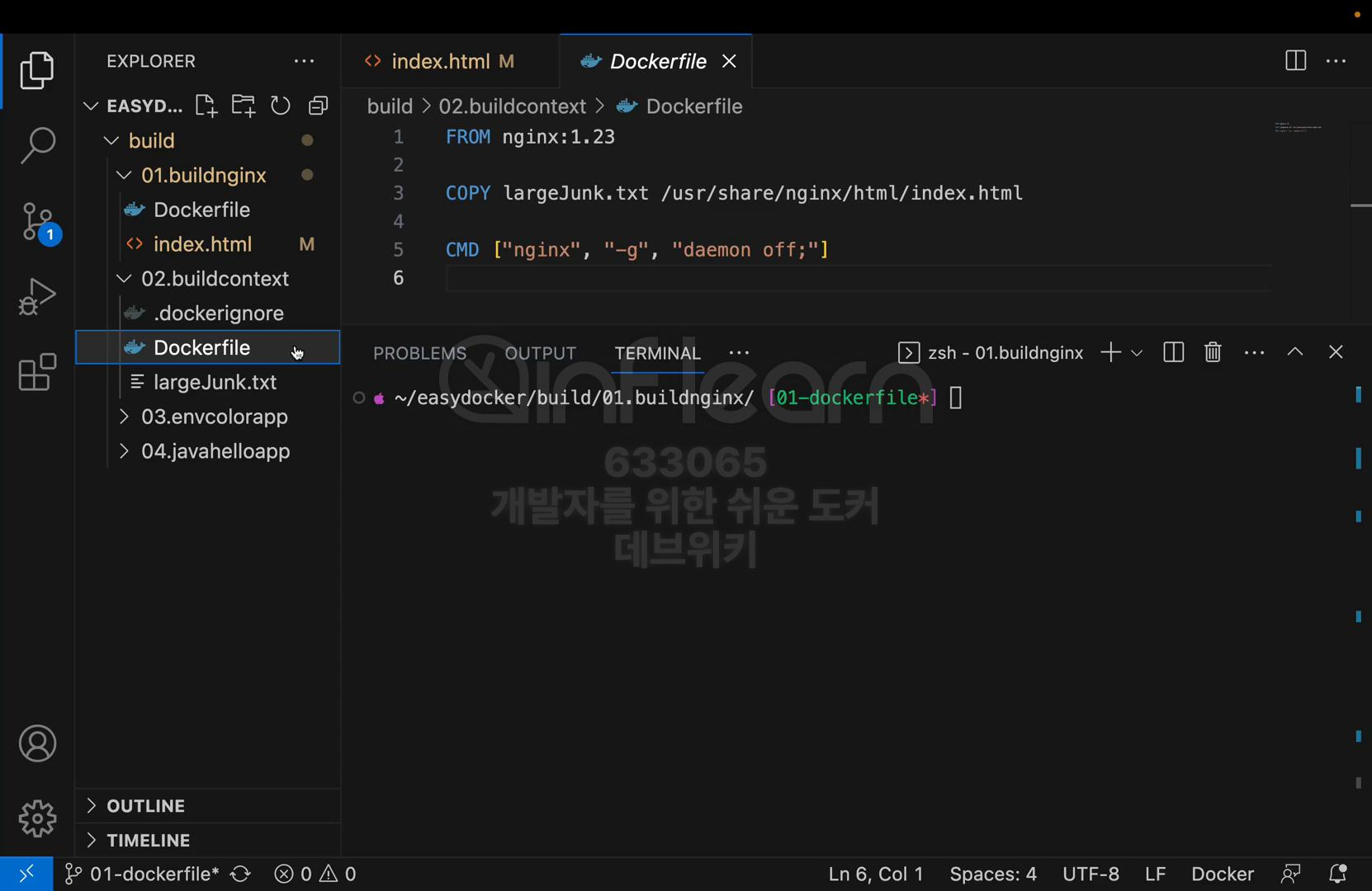 02.buildcontext 파일 안에 Dockerfile을 생성하고 위와 같이 작성한다. 이전에 학습한 01.buildnginx 폴더 안에 Dockerfile 의 COPY 지시어를 largeJunk.txt로 변경하면 된다. largeJunk.txt 파일을 매우 큰 파일이라고 가정하고 실습을 진행하는 것이다.