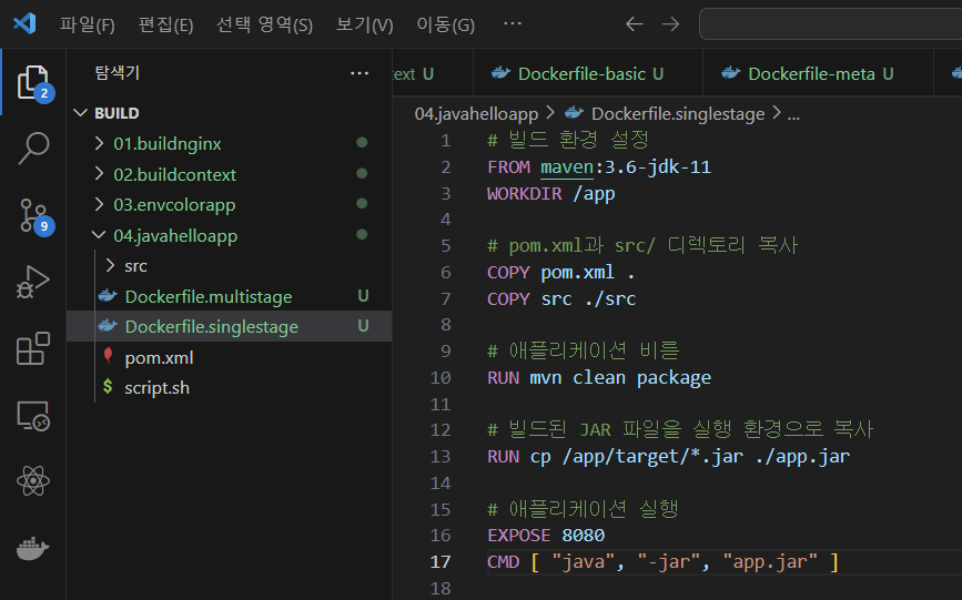 이런 방법으로 이미지를 빌드할 때 애플리케이션 빌드에 사용하는 빌드 스테이지와 이미지를 실행하는 실행 스테이지 두 개로 나누어서 빌드하는 방식을 멀티 스테이지 빌드라고 부른다.
