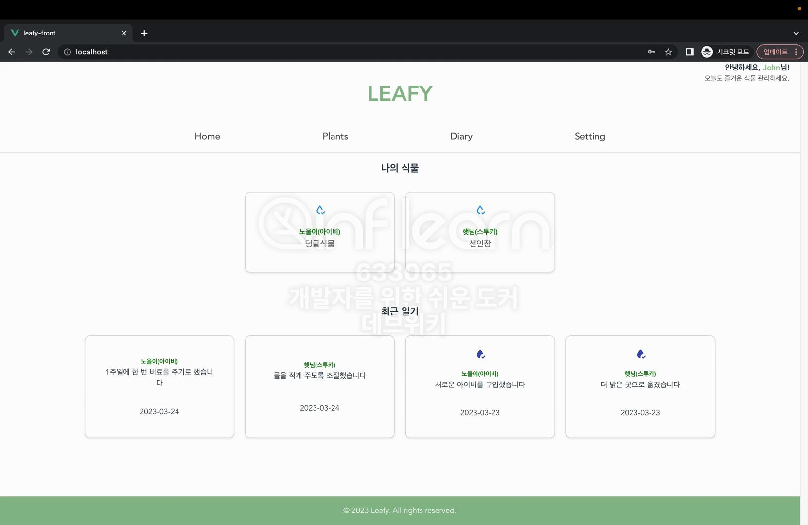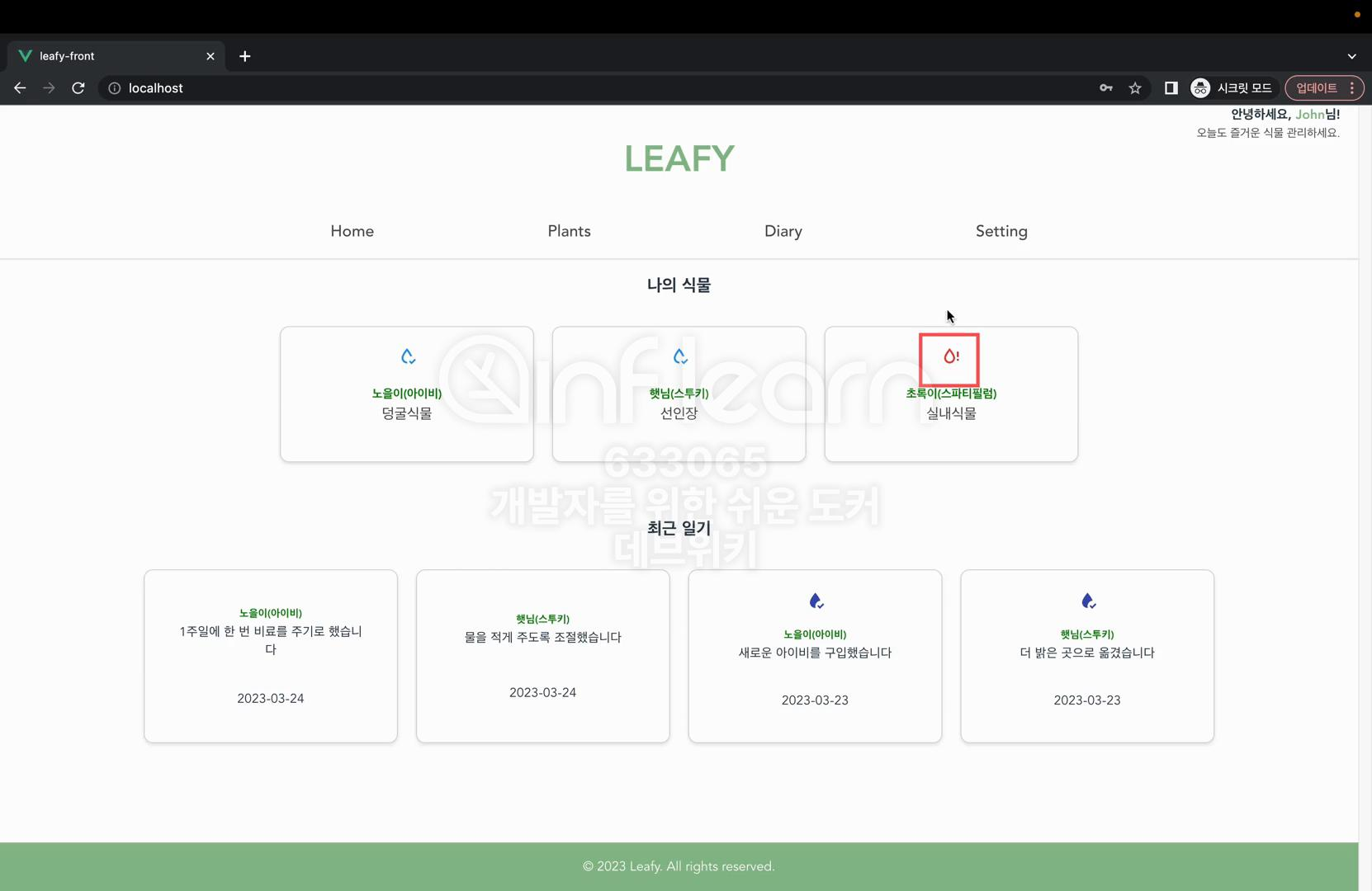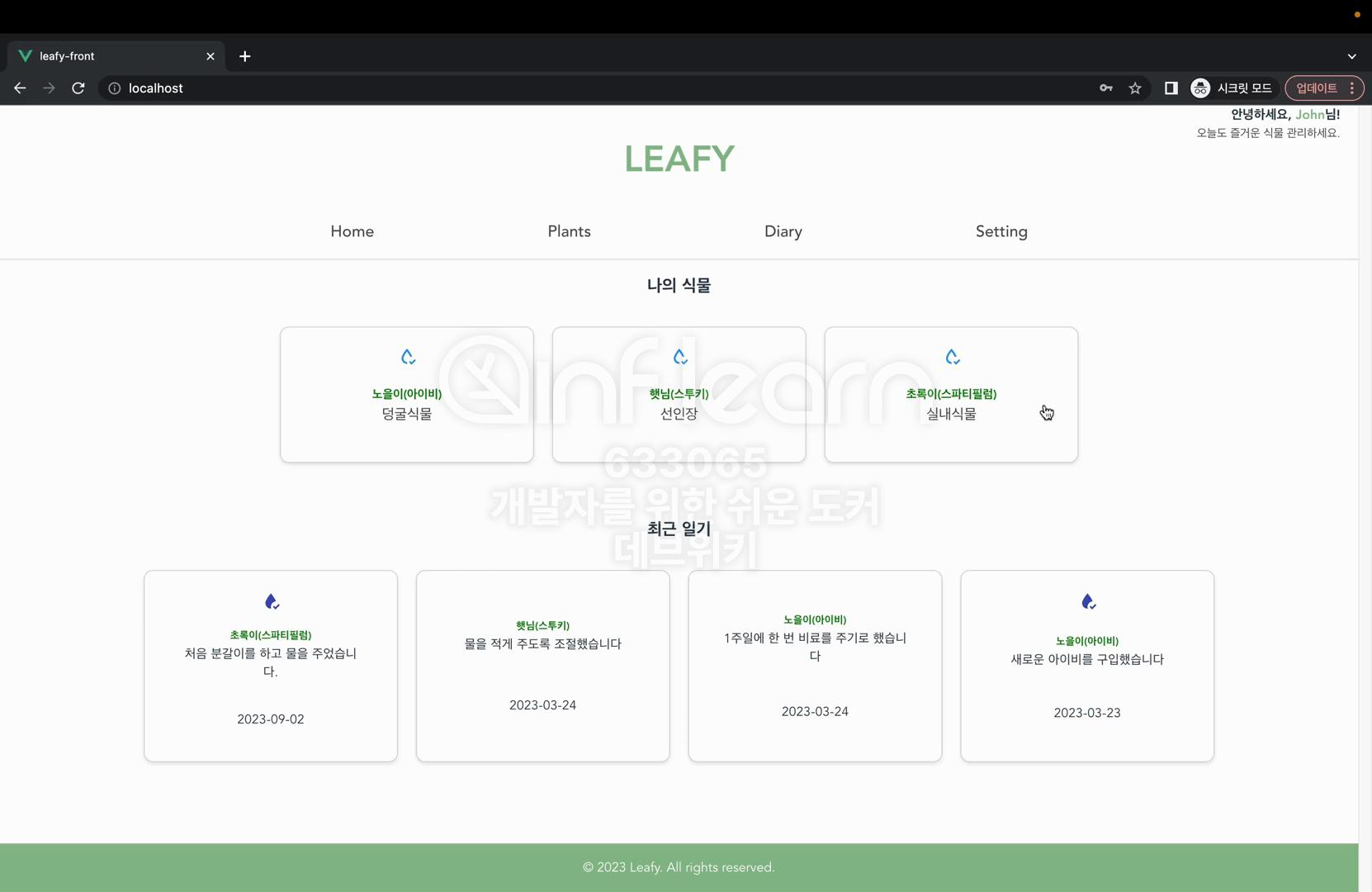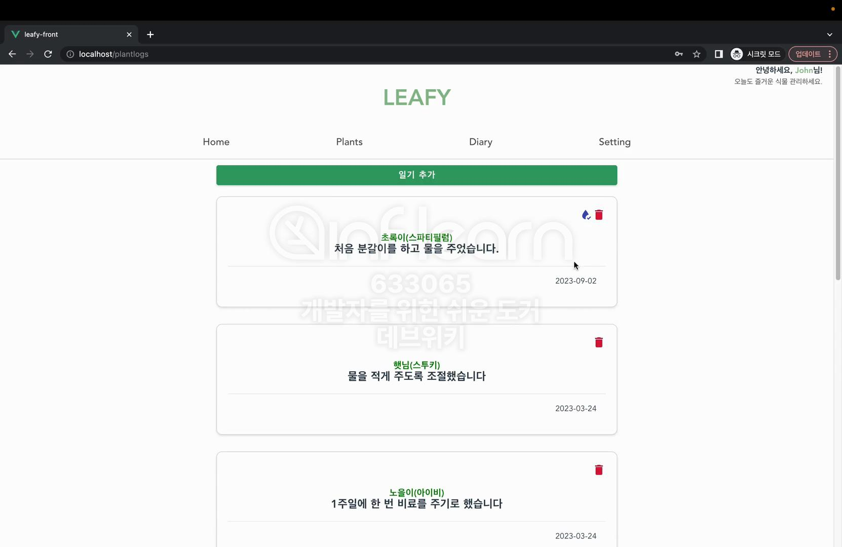 leafy 애플리케이션으로 접속하면서 세 가지 종류의 컨테이너를 구성했다. 프론트엔드 웹서버로 애플리케이션으로 접속하면서 세 가지 종류의 컨테이너를 실행했다. 프론트엔드 웹서버로 접속해서 파일을 다운로드 받은 다음에 이 파일을 브라우저로 출력하고 브라우저를 출력하는 과정에서 필요한 데이터들을 백엔드 애플리케이션의 API 요청을 통해서 불러왔다. 그리고 백엔드 애플리케이션은 데이터를 불러오는 요청을 받았을 때 PostgreSQL로 조회 요청을 보내서 실제로 저장되어 있는 데이터를 불러온 다음에 사용자에게 JSON 응답으로 제공해 주었다. 이렇게 페이지로 접근하는 과정에서 세 가지 모듈들이 유기적으로 상호작용하고 있다. 이제 웹사이트를 보시면 이 john123@qmail.com 사용자가 보유한 식물은 두 개이다. 이 두 가지 식물의 다이어리도 확인할 수 있다. 물을 주었을 때는 이렇게 물을 주었다는 표시가 나온다. 물을 준 날짜도 확인이 된다.