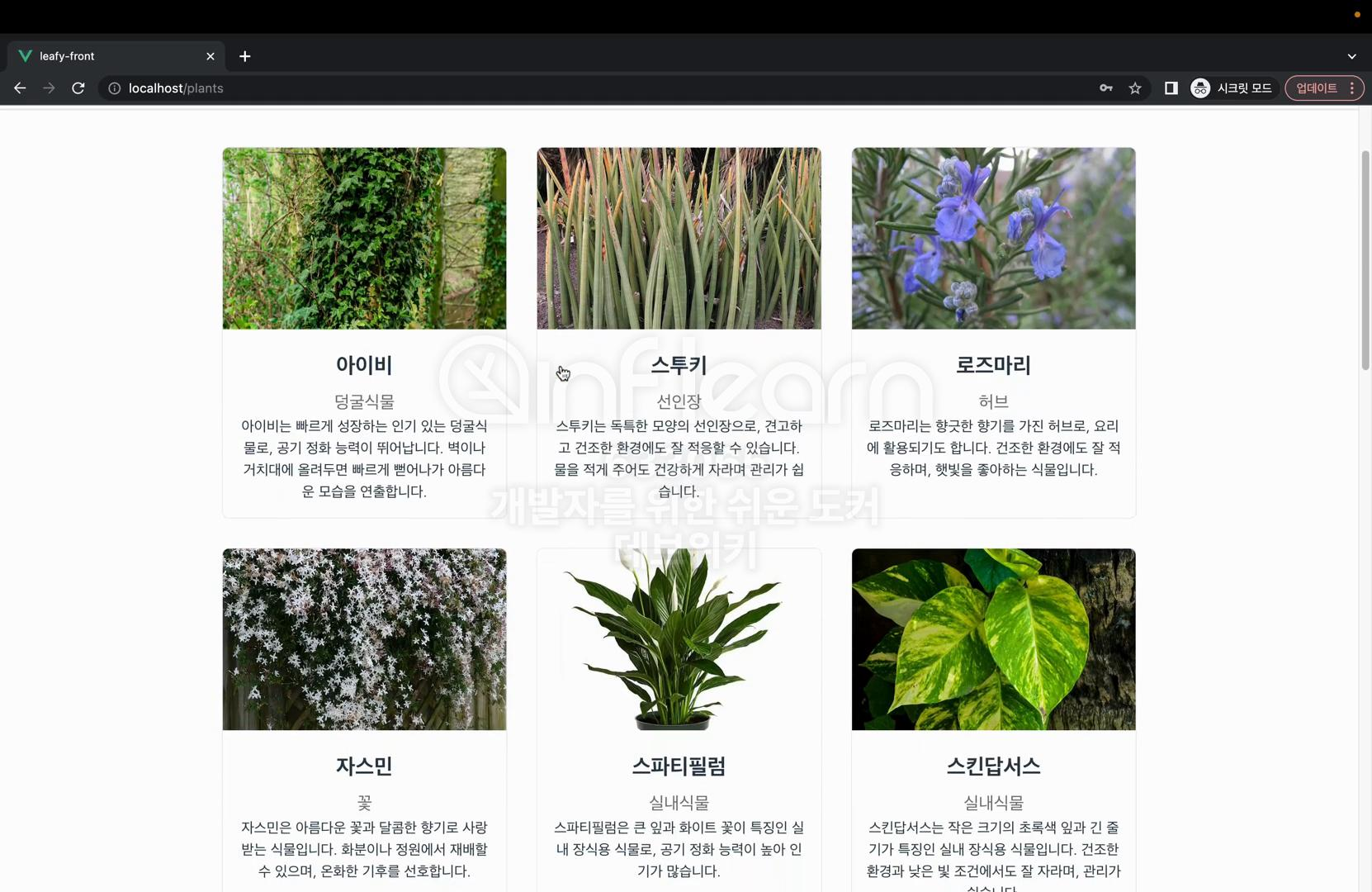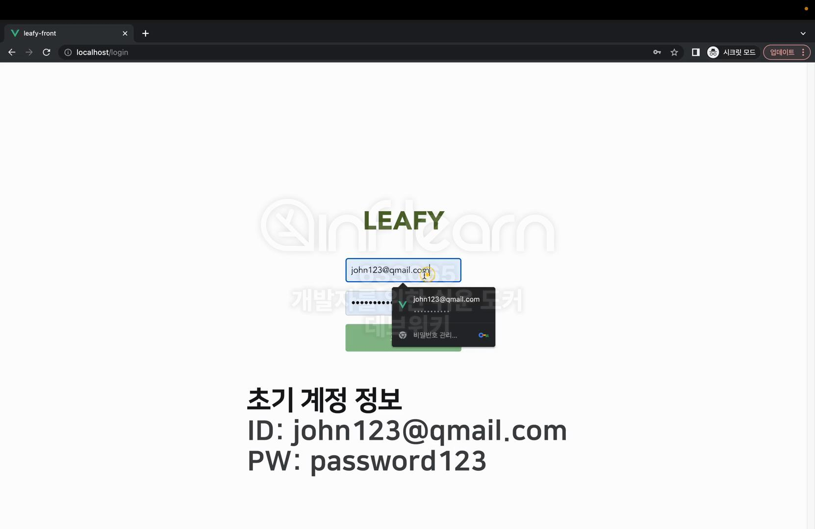이제 실행 중인 컨테이너의 리스트를 확인해 보면 이렇게 프론트, 백엔드, postgres가 모두 실행이 된 것을 확인할 수 있다. 브라우저를 띄워서 브라우저의 로컬 호스트로 접속해 보면 이렇게 leafy 접속 페이지를 확인하실 수 있다.