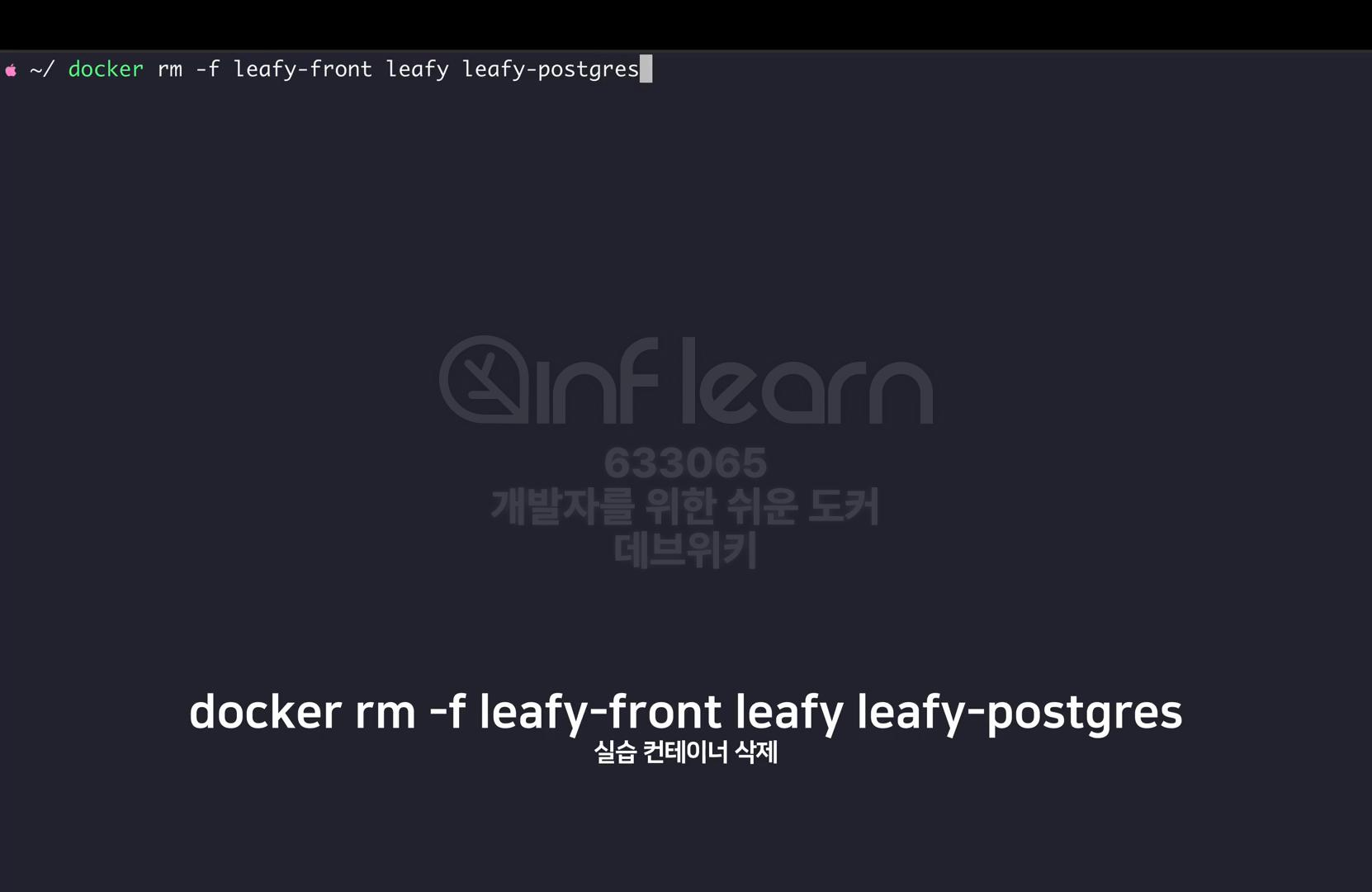 이제 실습에 사용한 컨테이너들을 모두 삭제한다. docker-rm-f에 leafy-front, leafy, leafy-postgres를 입력한다. 컨테이너를 모두 삭제하고 실습을 마친다. 이번 시간에는 leafy 애플리케이션을 실행해 보았다.