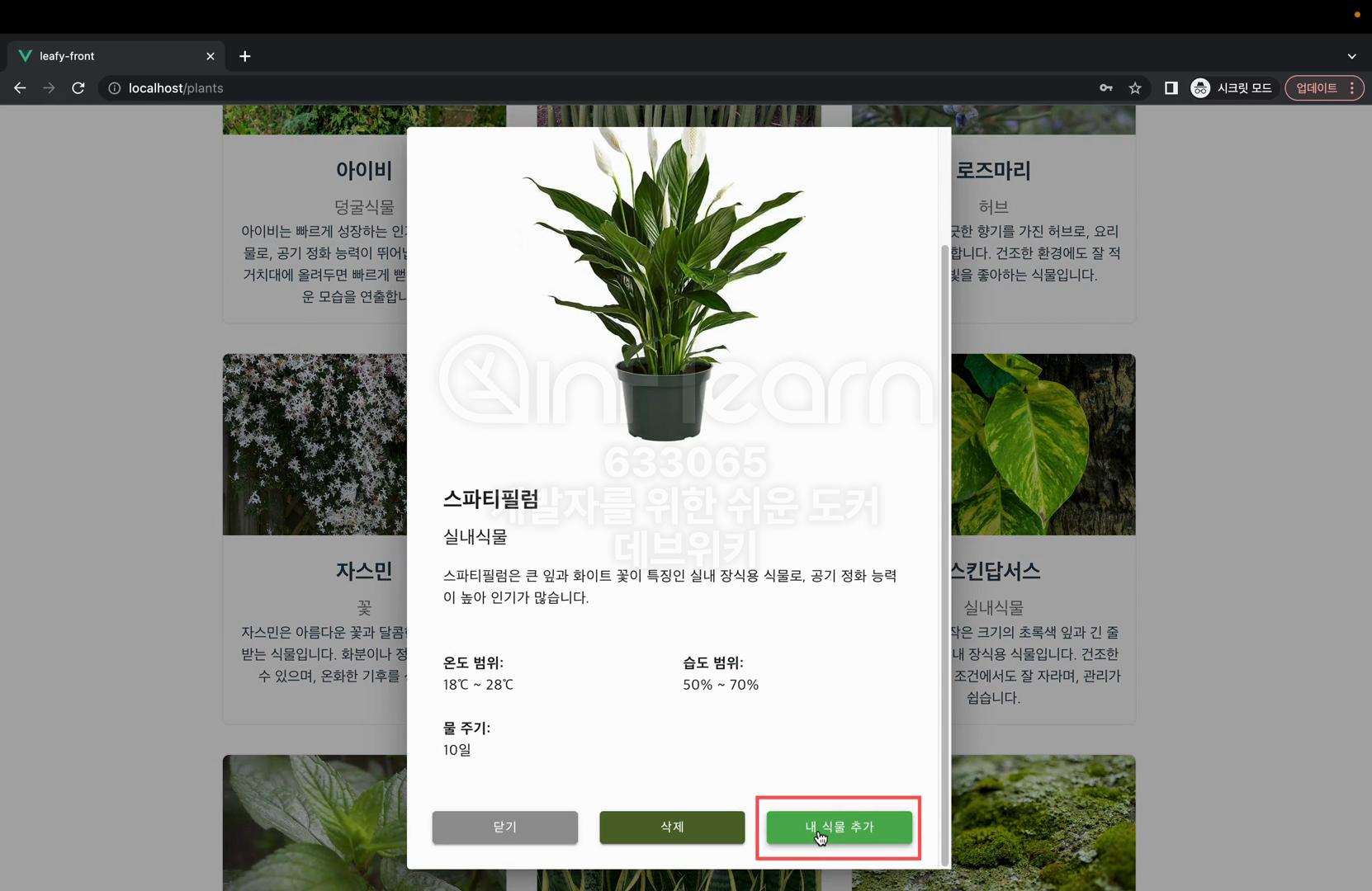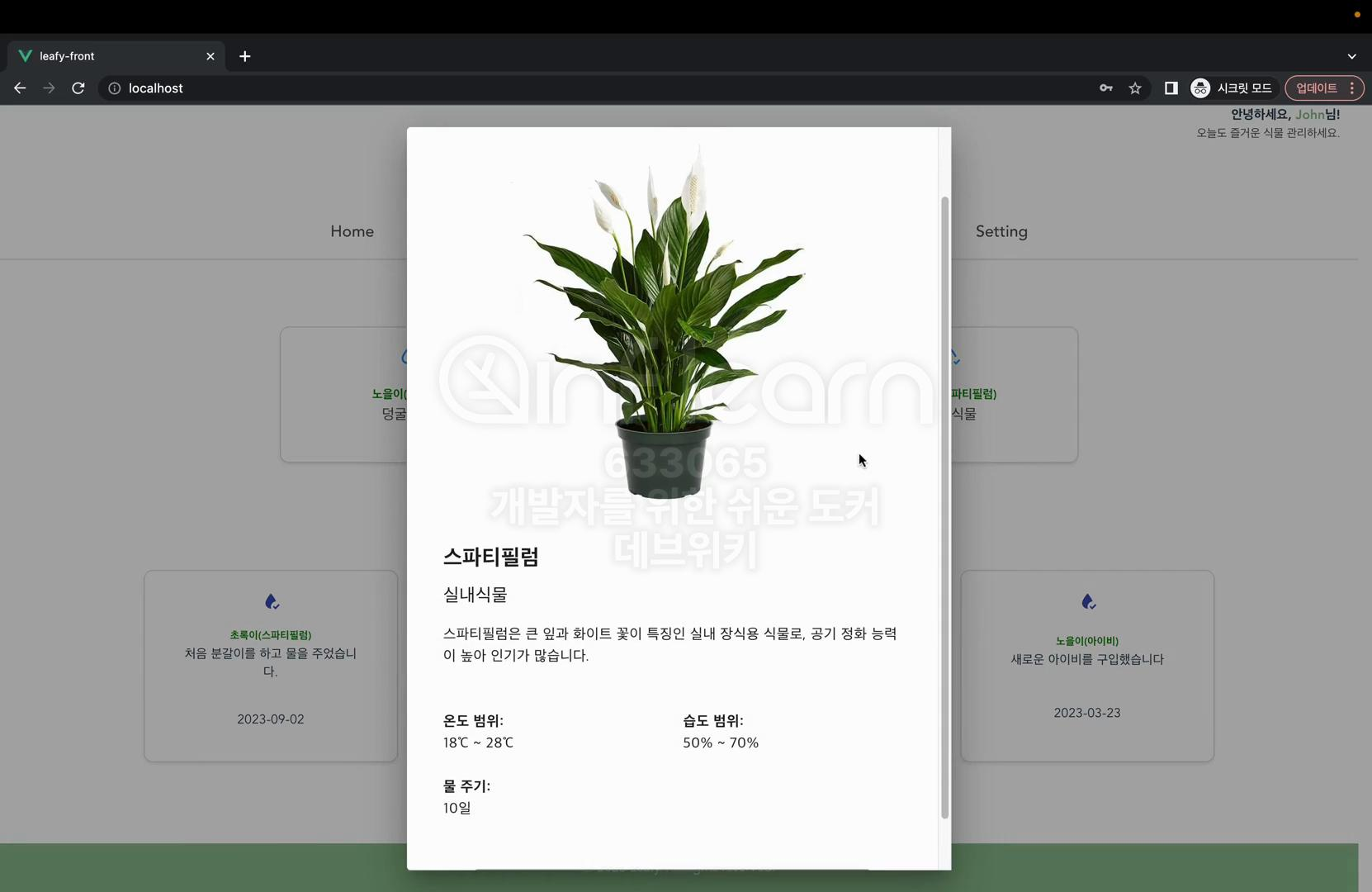 식물의 별칭을 입력하고 확인을 누르시면 이렇게 홈페이지에 들어갔을 때 나의 식물 리스트에 추가가 된 것을 확인하실 수 있다.