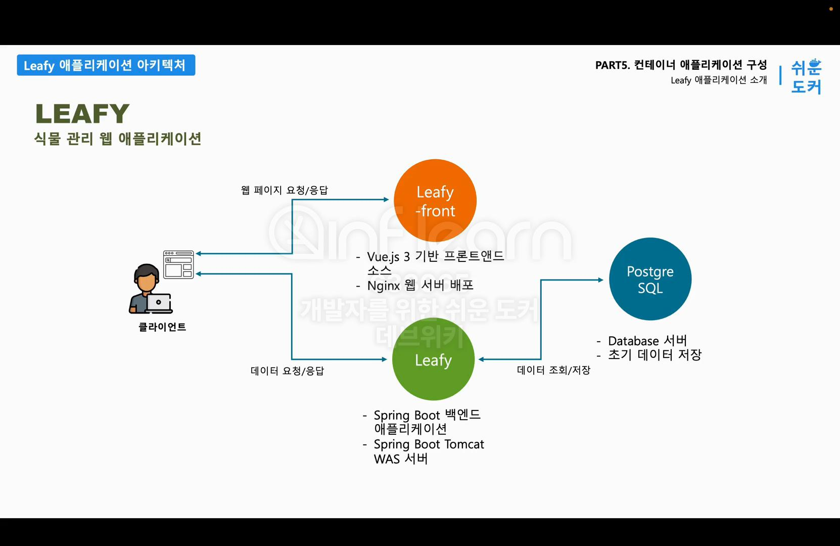 이 Web, WAS, DB 세 개의 컨테이너로 애플리케이션이 정상적으로 동작하도록 만드는 것이 이번 파트의 목표이다. 장표를 보시면 세 가지 서버의 관계와 역할에 대해서 더 명확하게 이해할 수 있다. 먼저 클라이언트는 웹서버의 주소를 브라우저에 입력해서 요청을 보낸다. 그러면 프론트 웹서버에서 index.html 파일과 같이 웹페이지를 응답으로 제공한다. 클라이언트가 웹페이지를 읽는 과정에서 회원이나 식물 정보에 접근해야 할 경우에는 브라우저에서 leafy 백엔드 애플리케이션으로 데이터 관련 요청을 보낸다. leafy 애플리케이션은 데이터를 조회하거나 저장이 필요하면 PostgreSQL에 접근해서 지속적으로 관리해야 하는 데이터를 조회하거나 저장한다. 각각의 모듈들을 이미지로 빌드해보기 전에 leafy 애플리케이션이 잘 실행되는지 테스트해보자.