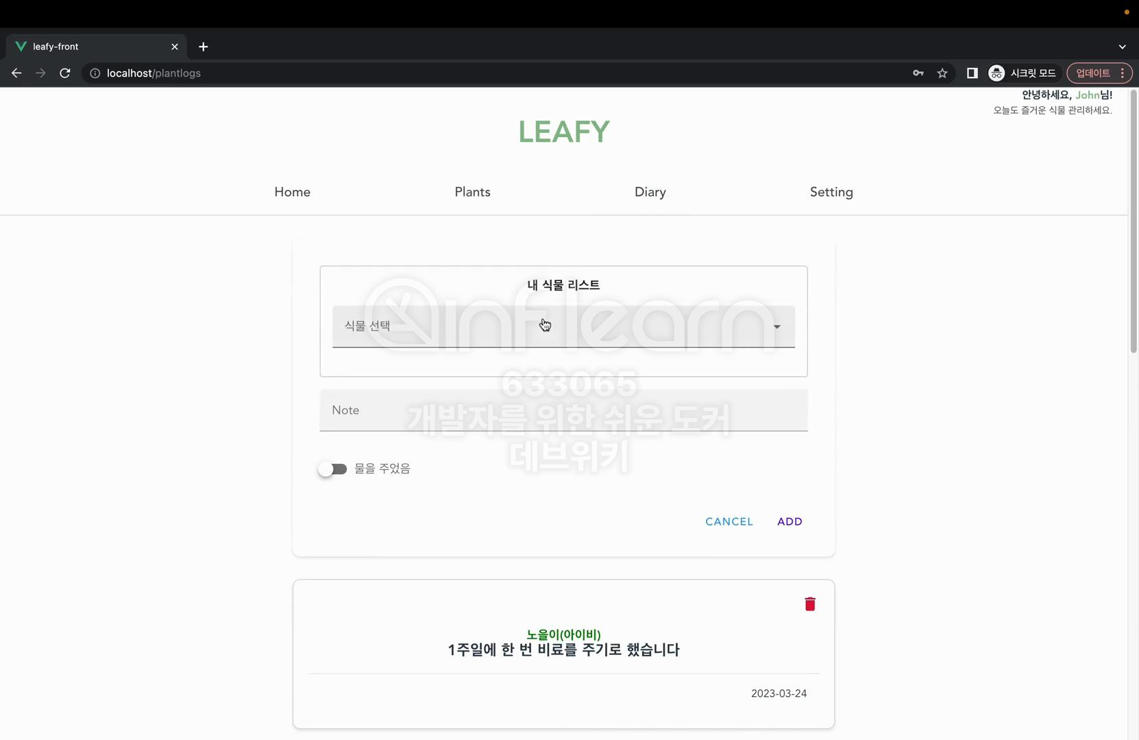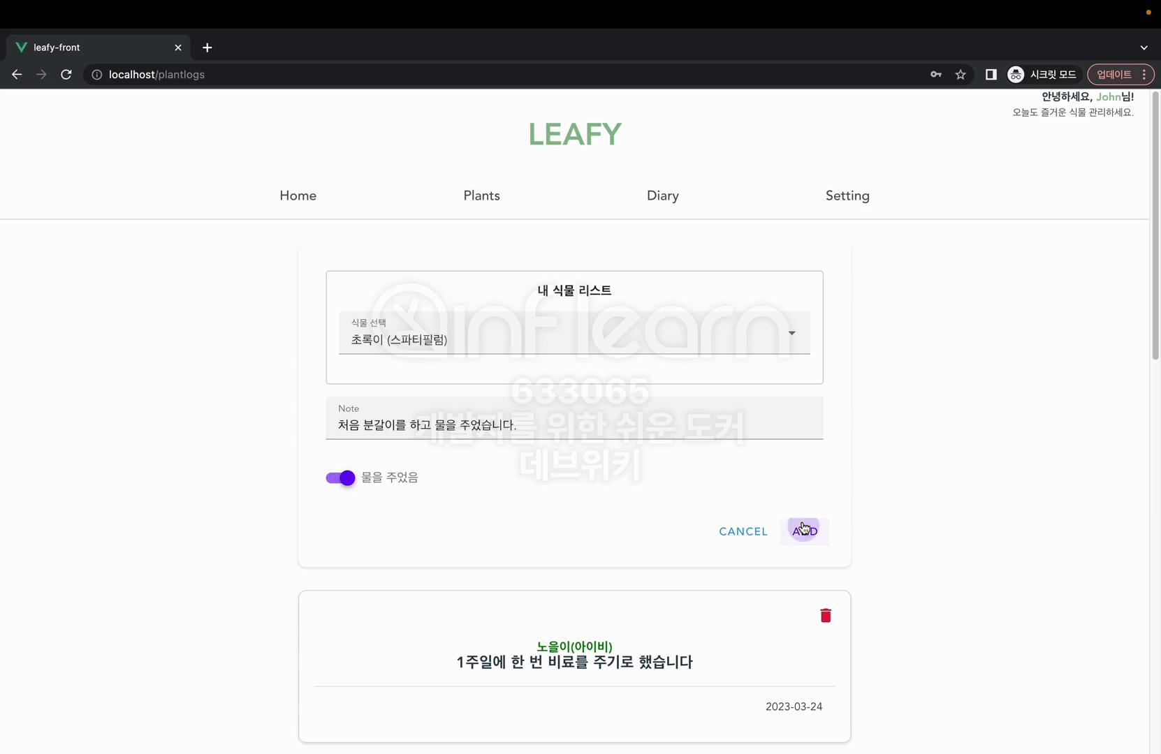 식물 리스트에서 방금 추가한 초록이를 선택하고 간단한 일기를 작성하자. 그리고 물을 주었다는 표시를 한 뒤에 ADD를 누르면 이렇게 다이어리가 추가된 것을 그리고 물을 주었다는 표시를 한 뒤에 애드를 누르면 이렇게 다이어리가 추가된 것을 확인할 수 있다.
