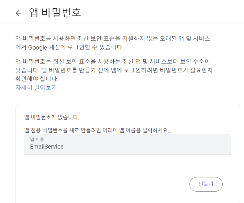 앱 비밀번호 목록에 생성된 앱 이름과 생성일을 확인할 수 있다. 여기까지 잘 따라왔다면 구글 이메일 서버를 사용하기 위한 사전 준비는 끝이다. 그리고 쓰레기통 아이콘을 클릭하면 삭제된다.