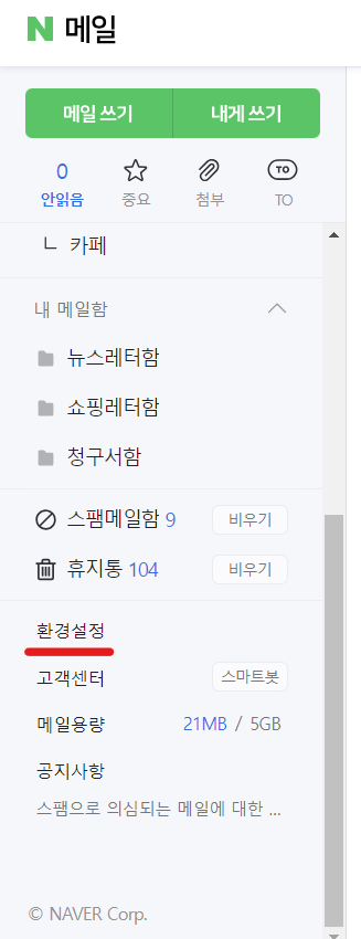 네이버 이메일 홈페이지로 이동한다. 그리고 왼쪽 탭에서 스크롤을 내려서 휴지통 아래의 환경설정을 클릭한다.