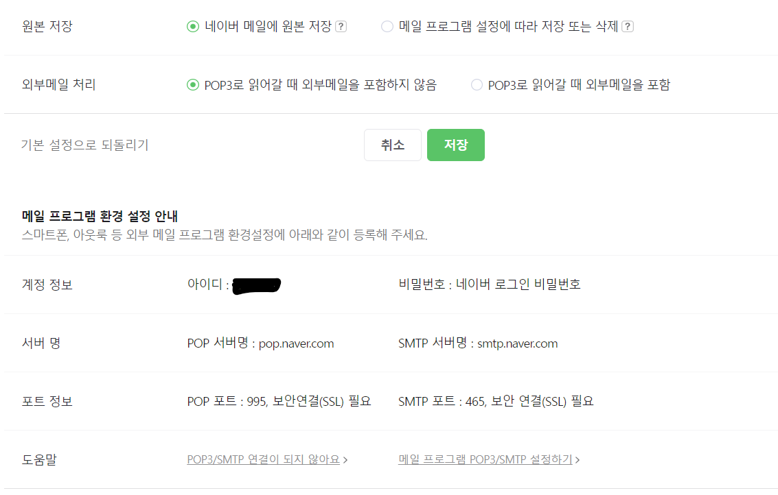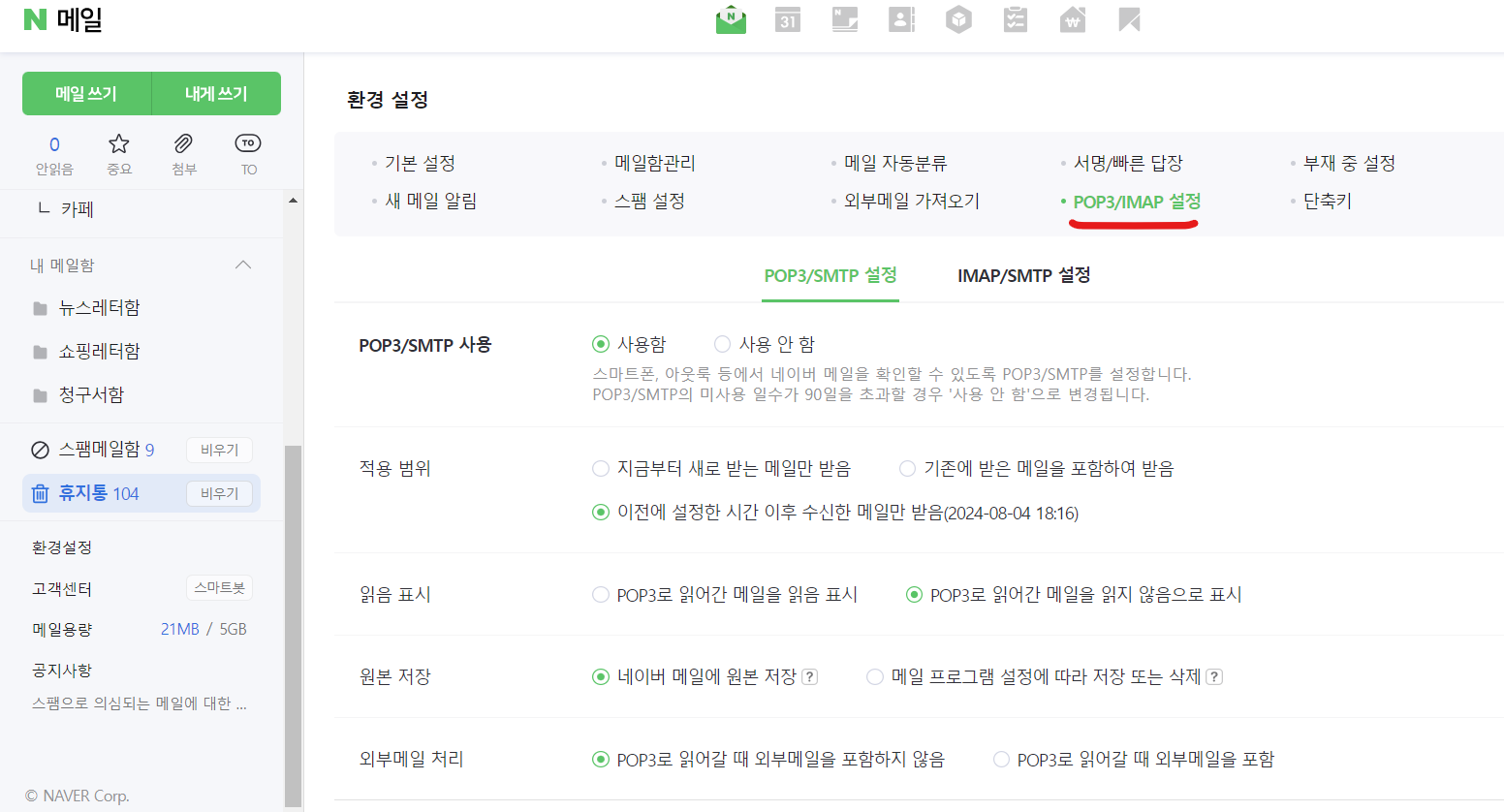 환경 설정에서 POP3/IMAP를 클릭한다. 그리고 그림과 같이 POP3/SMTP을 설정하고 저장한다.