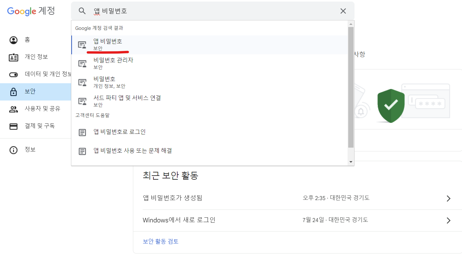Google 계정 페이지로 이동했다면 검색창에 앱 비밀번호를 작성한다. 그리고 검색창 하단에 등장한 앱 비밀번호를 클릭한다. 앱 비밀번호를 수행하기 전에 반드시 구글 계정의 2차 비밀번호까지 설정을 모두 마쳐야 한다.