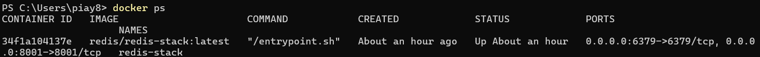 실행중인 도커 컨테이너를 확인한다. 정상적으로 명령어를 입력했다면 redis-stack 컨테이너가 실행 중인 것을 확인할 수 있다.