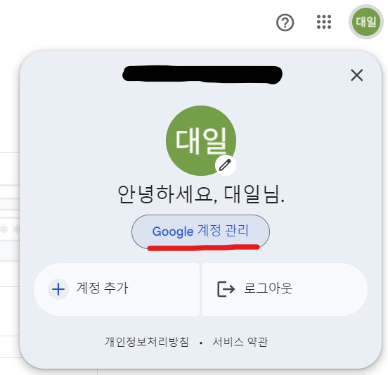 구글 홈페이지에서 오른쪽 상단의 내 프로필을 클릭한다. 그리고 Google 계정 관리를 클릭한다.